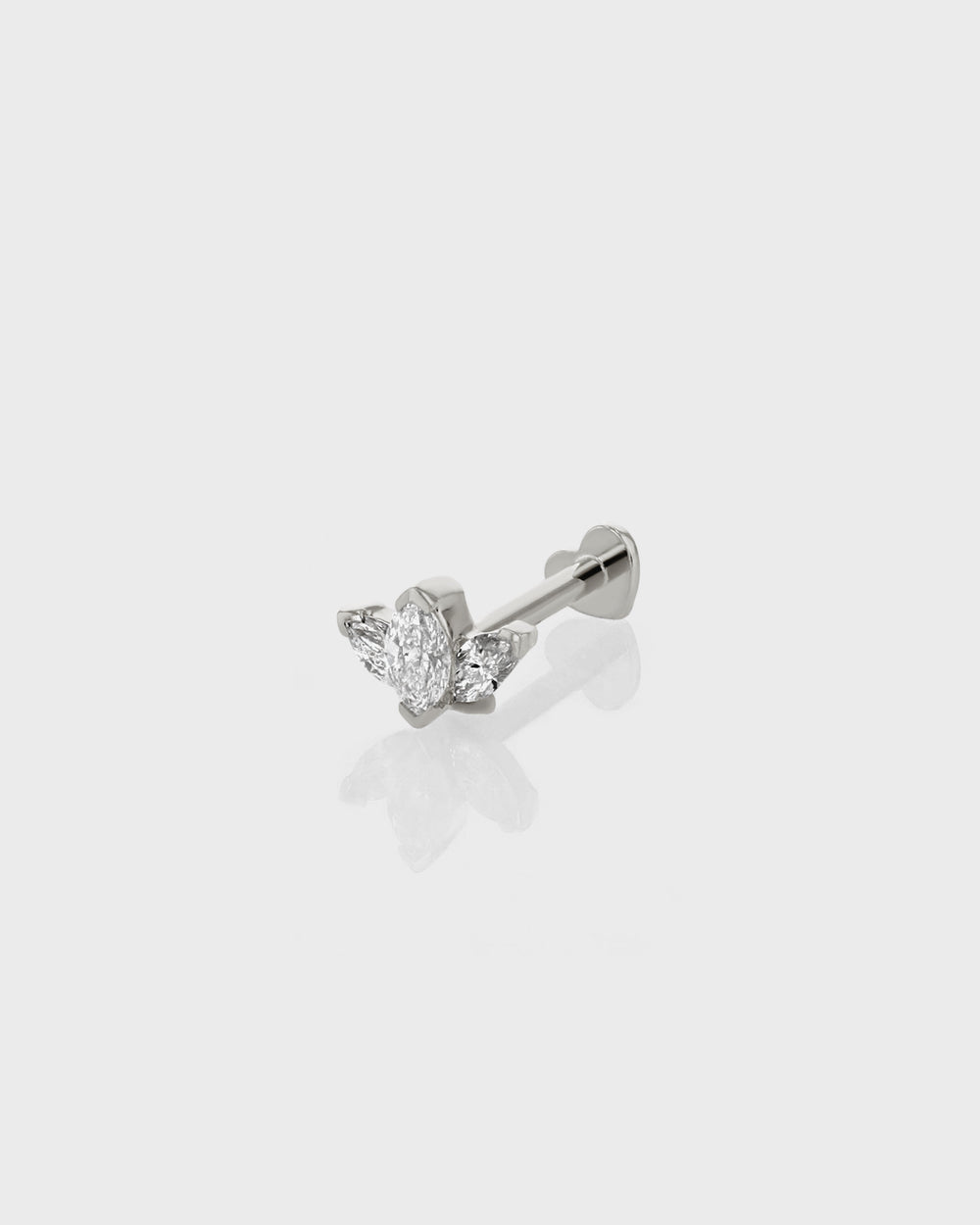 Championing three overlapping natural marquise diamonds, the Petite Waratah Cartilage Earring is a delicate stud for considered Ear Alchemy Styling. Crafted in platinum, it features an internally threaded post with a signature flat heart backing. This piece is sold as a single and is suitable for both healed and initial piercings.