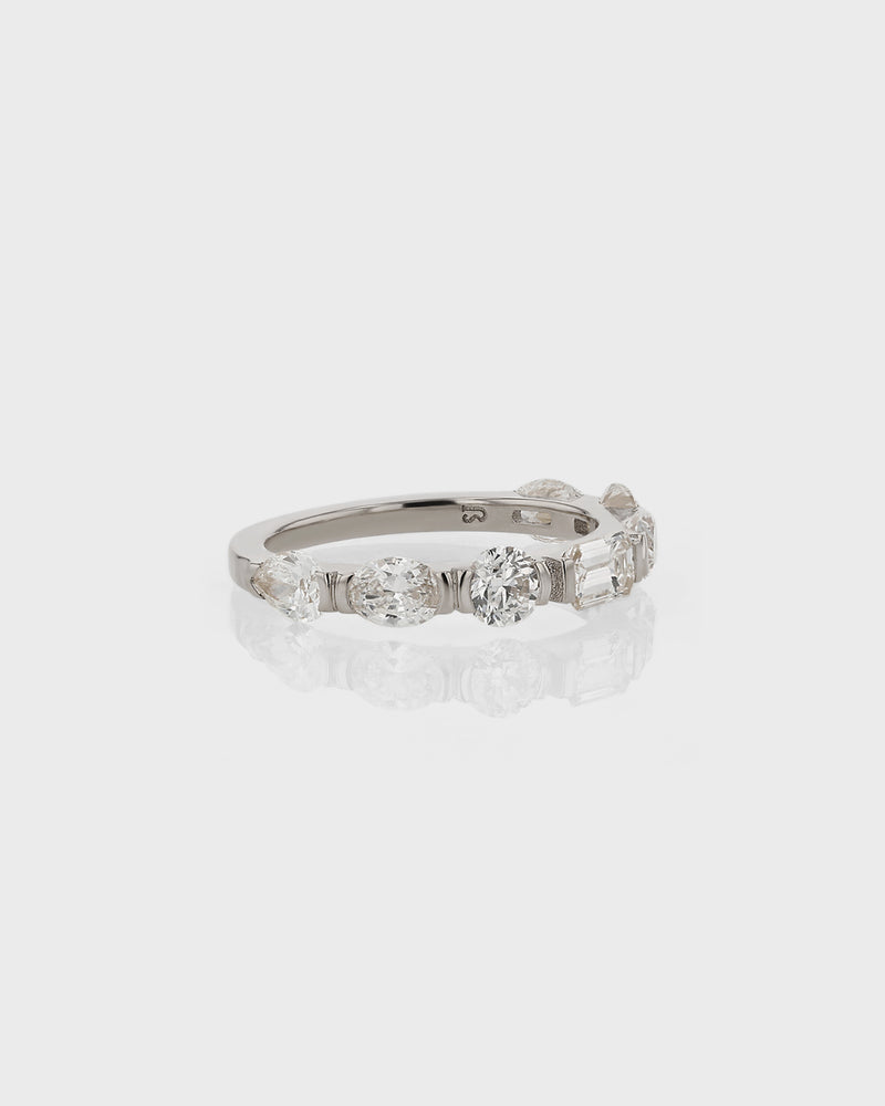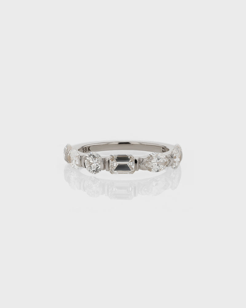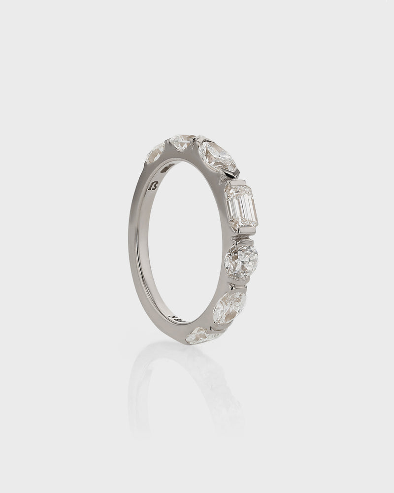 Featuring seven diamonds in five different cuts – round, marquise, oval, pear and emerald – this bold ring embraces clean lines, with each stone appearing to float between suspense-style settings.
