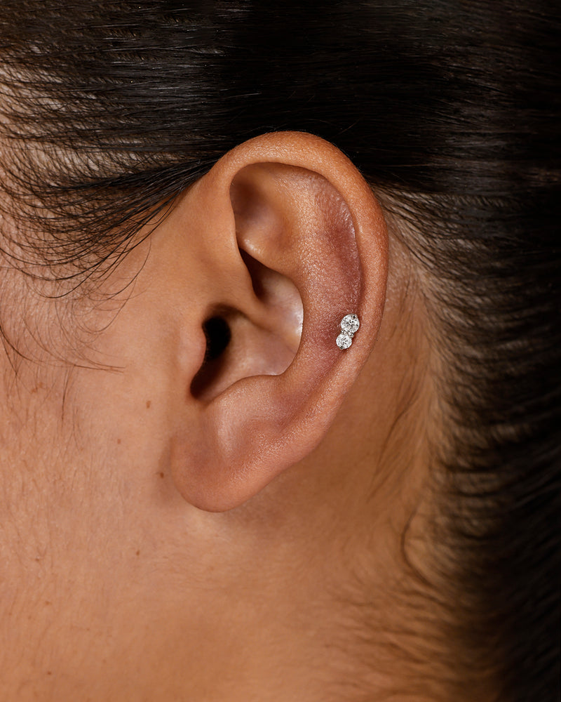 The Duet Cartilage Earring is a simple and classic stud featuring a poetic duo of petite round diamonds, with one slightly larger than the other to create a gradient effect. Inspired by our Ouroboros Daith Hoop, this piece completes the suite including the Quartet Earring and Double Ouroboros Hoop. Crafted in 18-karat solid gold, this style is only available to purchase as a single piece and is suitable for initial piercings.