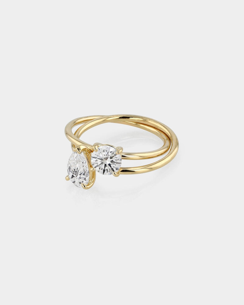 Experiment with design details that make up a SARAH & SEBASTIAN Engagement Ring. The Gwen Ring features a pear cut and round brilliant cut diamond, claw set on two interlocking fine bands. All elements of this ring including band style, metal, carat and colour can be made bespoke as per your budget and request. From price is based on two 0.5ct, F colour and VS2 clarity diamonds on a 18k gold band.