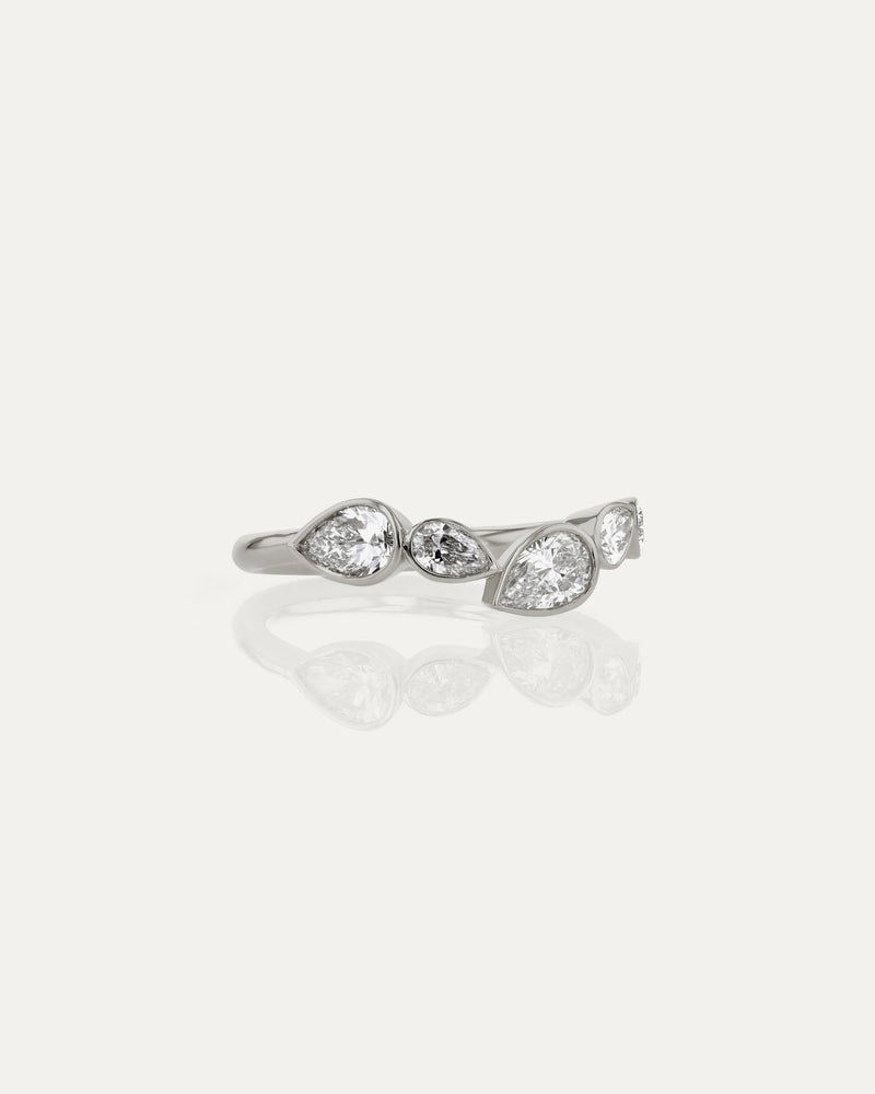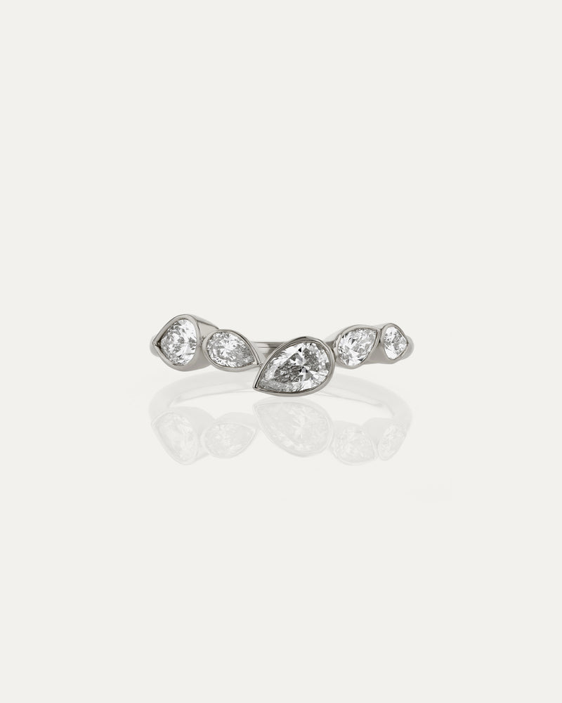 With a soft, undulating silhouette, the Pear Bezel Wave Ring makes for a unique wedding band or statement piece. Handcrafted in 18-karat gold, this standout ring champions five bezel-set natural pear diamonds in varying sizes, with an unconventional design drawing inspiration from rolling ocean waves. Pair it with our signature solitaire diamond engagement rings for effortless sophistication.