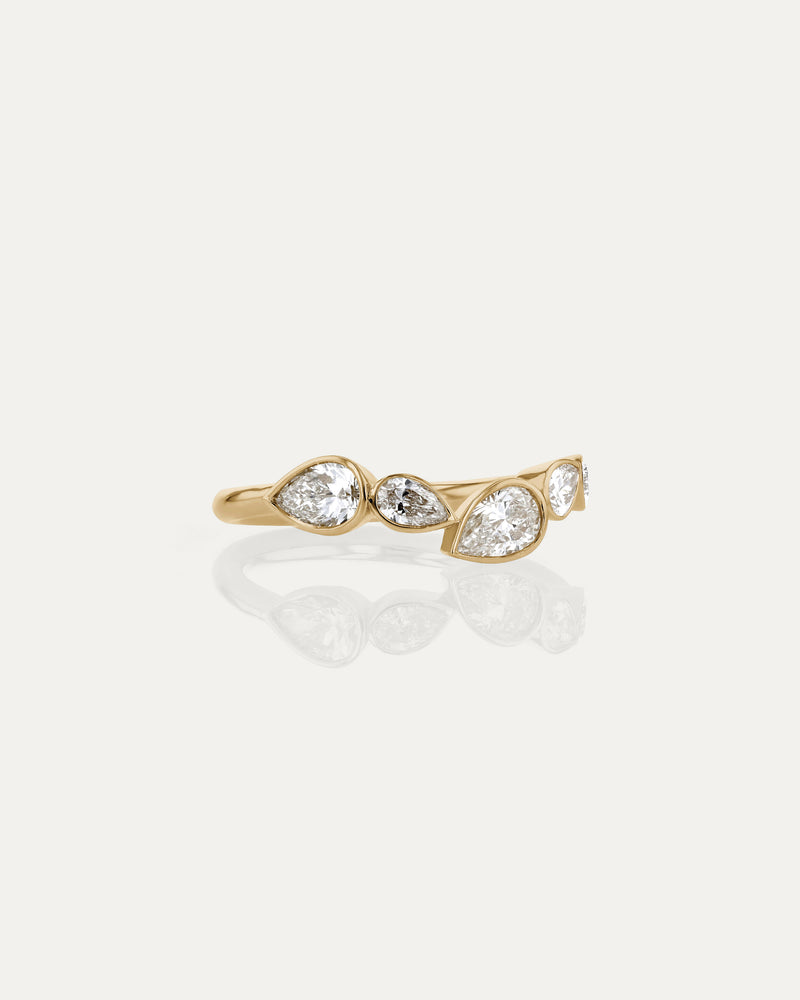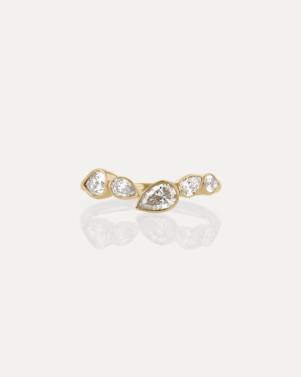With a soft, undulating silhouette, the Pear Bezel Wave Ring makes for a unique wedding band or statement piece. Handcrafted in 18-karat gold, this standout ring champions five bezel-set natural pear diamonds in varying sizes, with an unconventional design drawing inspiration from rolling ocean waves. Pair it with our signature solitaire diamond engagement rings for effortless sophistication.