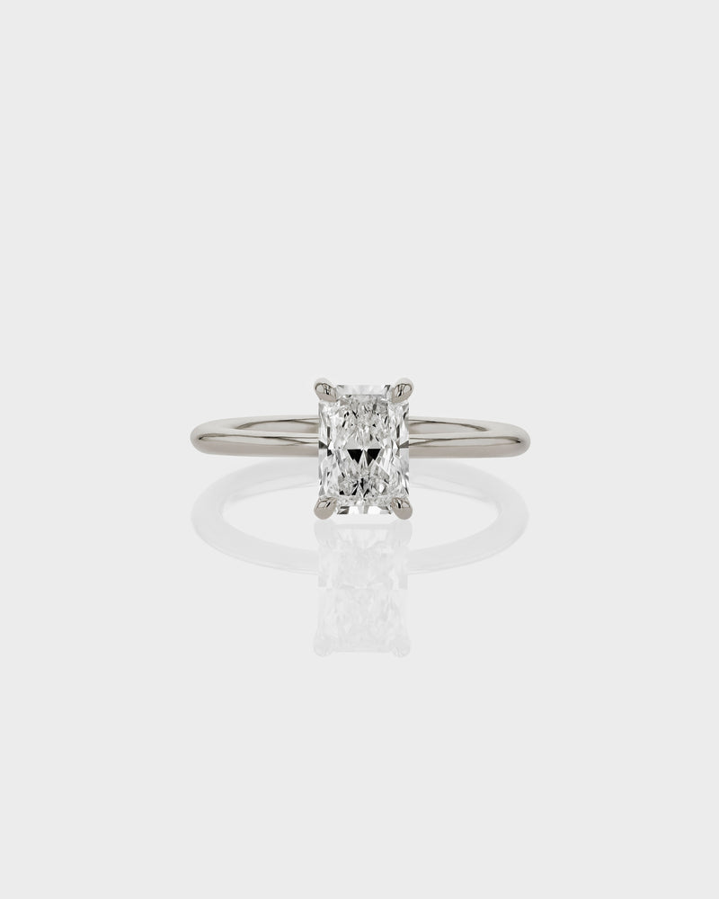 Experiment with design details that make up a SARAH & SEBASTIAN Engagement Ring. The Radiant Engagement Ring features a 4 claw radiant cut diamond on a signature round tapered band.