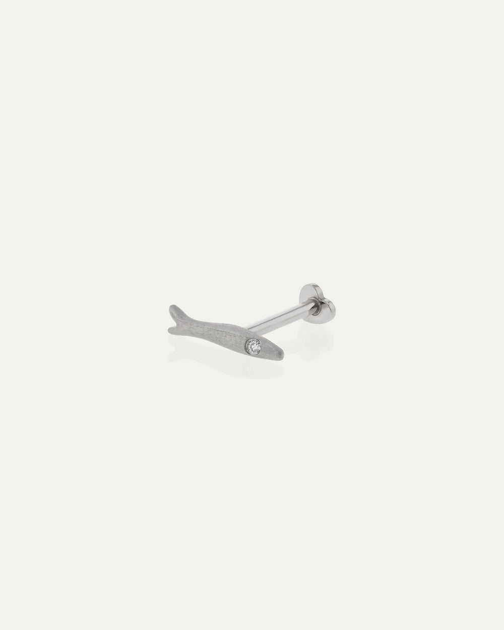 Inspired by sun-drenched summer days, the Sardine Cartilage Earring is a treasured piece to add to your Ear Alchemy styling. Designed in our Sydney studio, it’s made from brushed platinum and is finished with a natural diamond eye. This internally threaded earring is specifically designed for cartilage piercings and is suitable for initial piercings. Sold as a single piece.