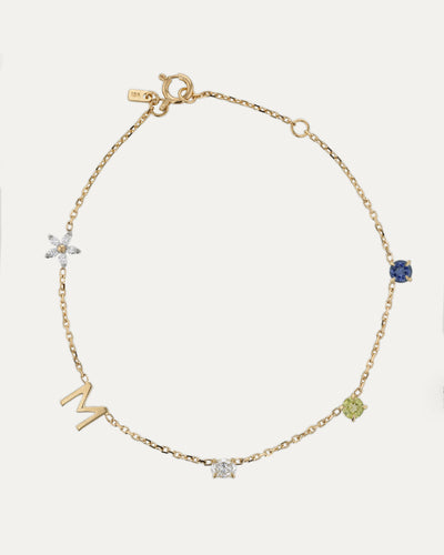 The original personalised bracelet by SARAH & SEBASTIAN. Select letters or birthstones to tell your story—handcrafted in 14k or 18k solid gold, made to order in Sydney.