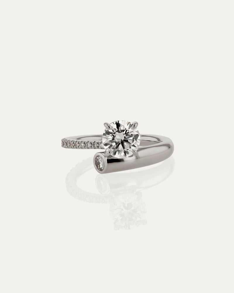 Championing a timeless floating round diamond, the Aria Round Eternity Engagement Ring features a wrapped 18-karat white gold or platinum band that follows the shape and form of a matching round accent diamond.