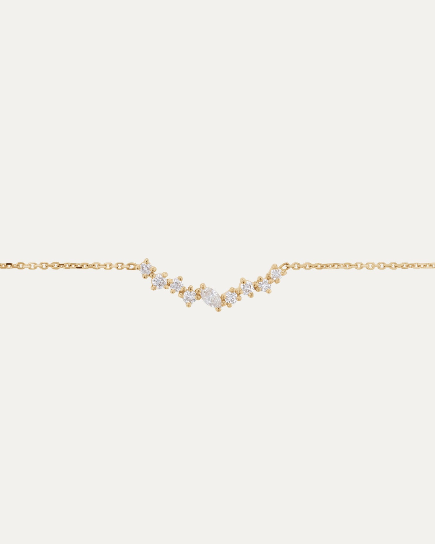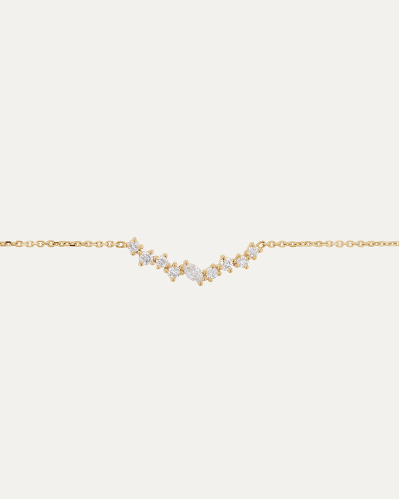 This bracelet features Sarah & Sebastian’s signature fine gold chain, which supports a light-catching pendant made of marquise and round diamonds. The organic clustered shape features nine white diamonds, and is cast in 14-karat white or yellow gold. The Gossamer Bracelet is dainty enough to layer with other bracelets, but really shines when worn solo.