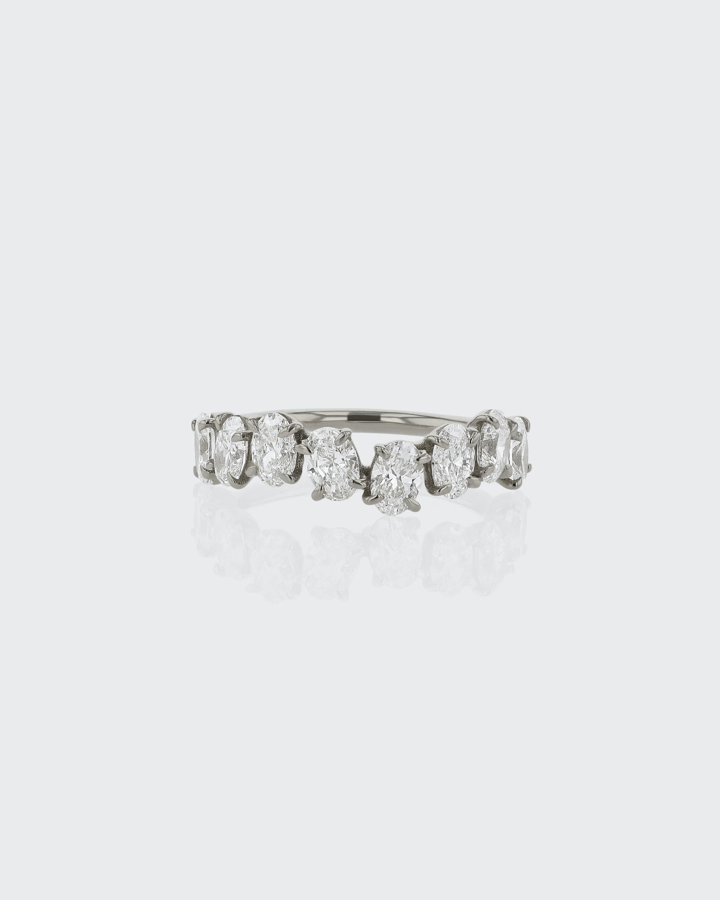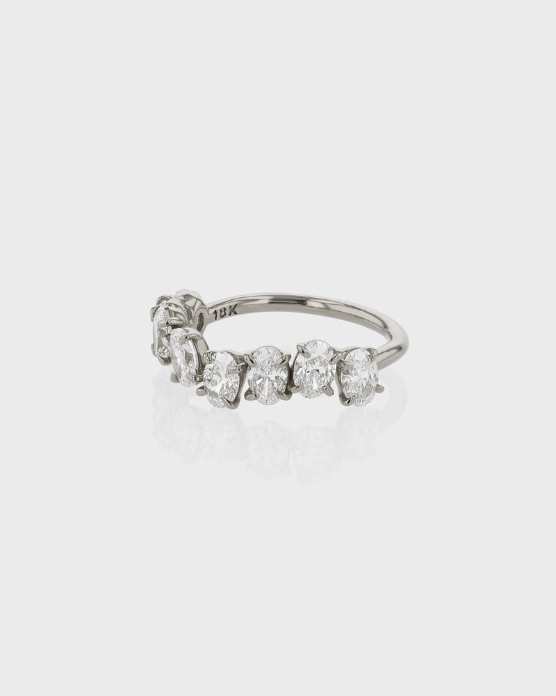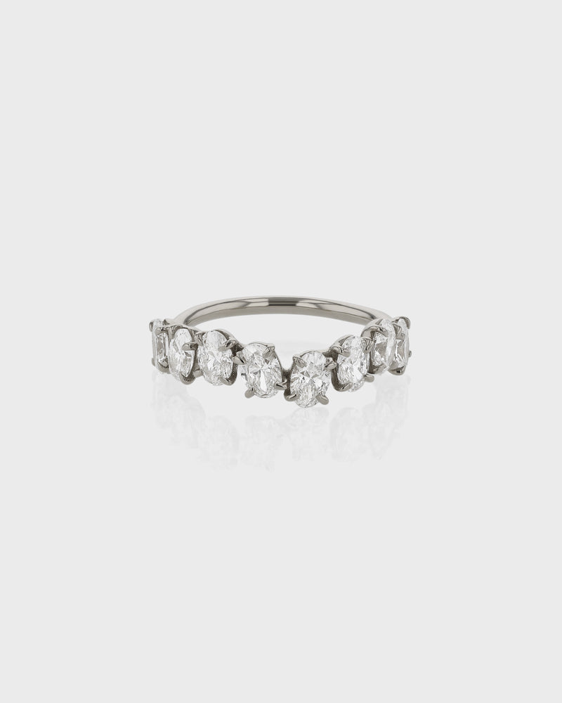 Sarah & Sebastian creative director Sarah Gittoes was inspired by endless love when she crafted the Half Endless Oval Diamond Ring. An unconventional engagement ring or simply a piece to wear and treasure forever, this ring features a cluster of oval cut diamonds claw set, halfway around on a 18-karat gold band.