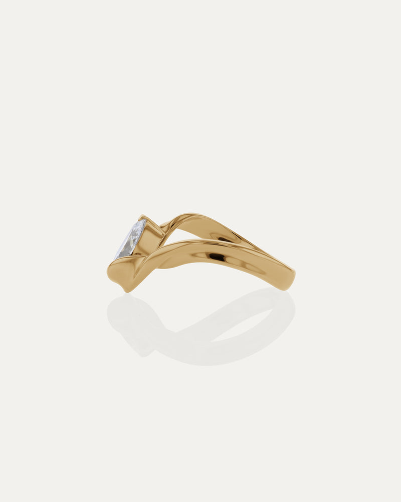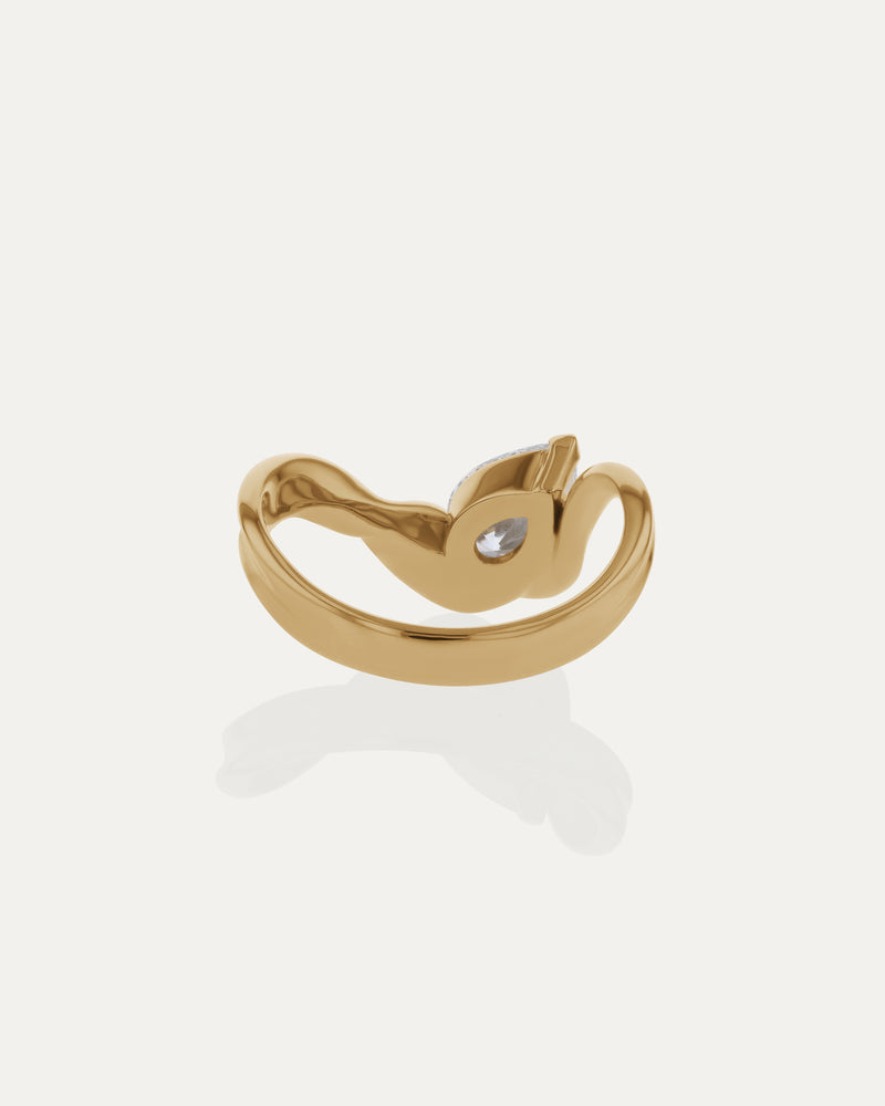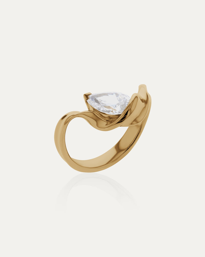 Sculpted in 18 karat yellow gold, the Marine Pear Diamond Engagement Ring features a natural pear-cut white diamond, set within a sculptural band.