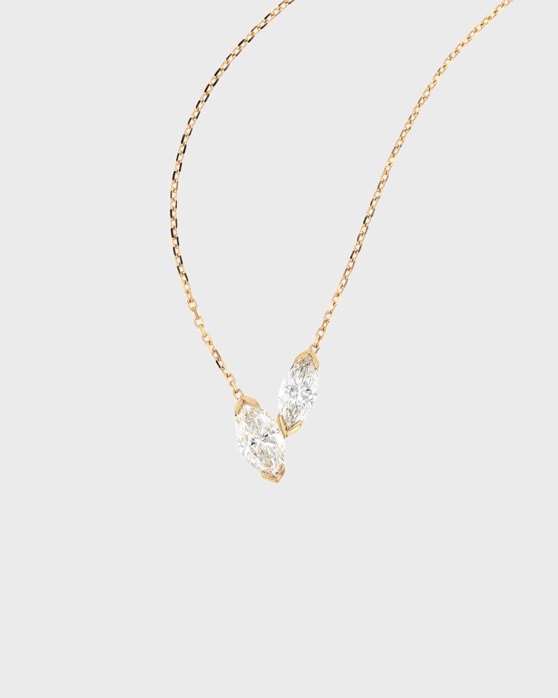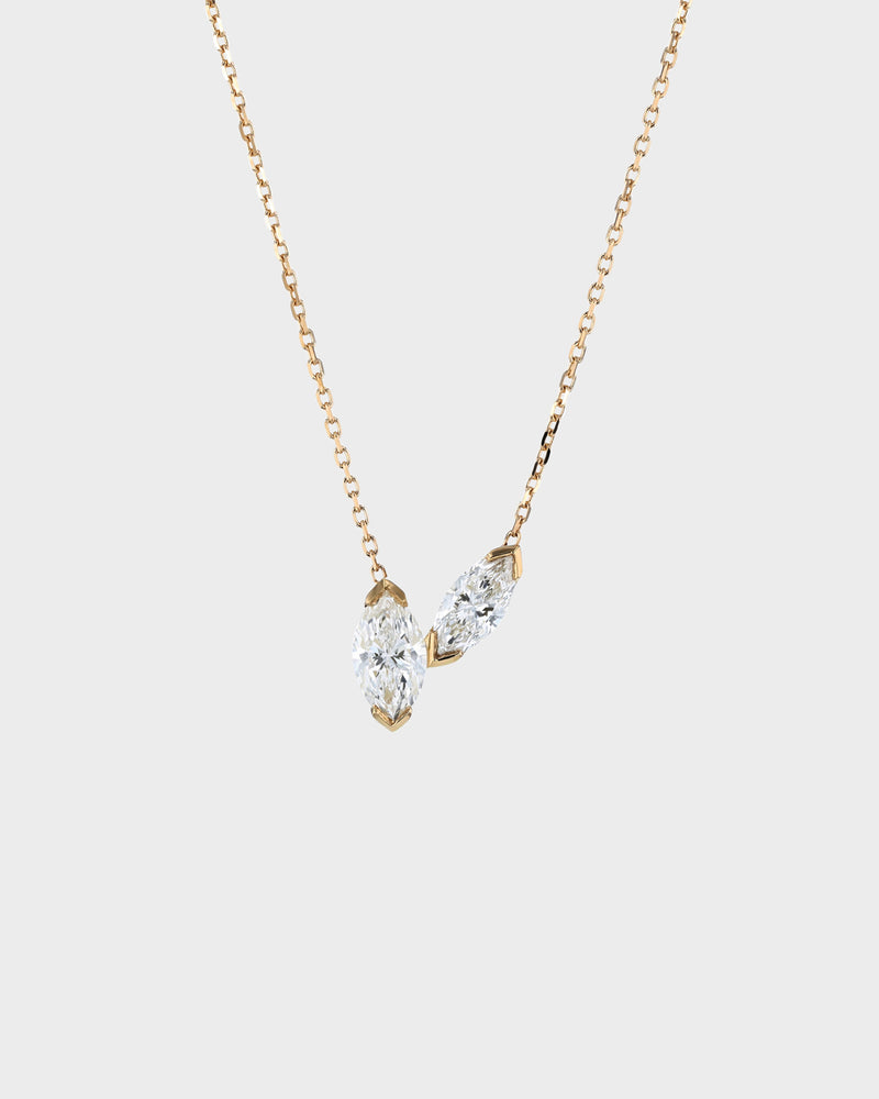 Named after the French saying meaning 'you and me', the Marquise Toi Et Moi Necklace is a one of a kind piece, symbolising the power of unity. It heroes two asymmetric marquise-cut diamonds with a suspense setting. Elements of this necklace including chain length and diamond carat can be made bespoke upon request. From price is based on a 0.5ct feature stone and 0.3ct secondary stone, F-G colour and VS-SI clarity diamond in 18-karat gold.