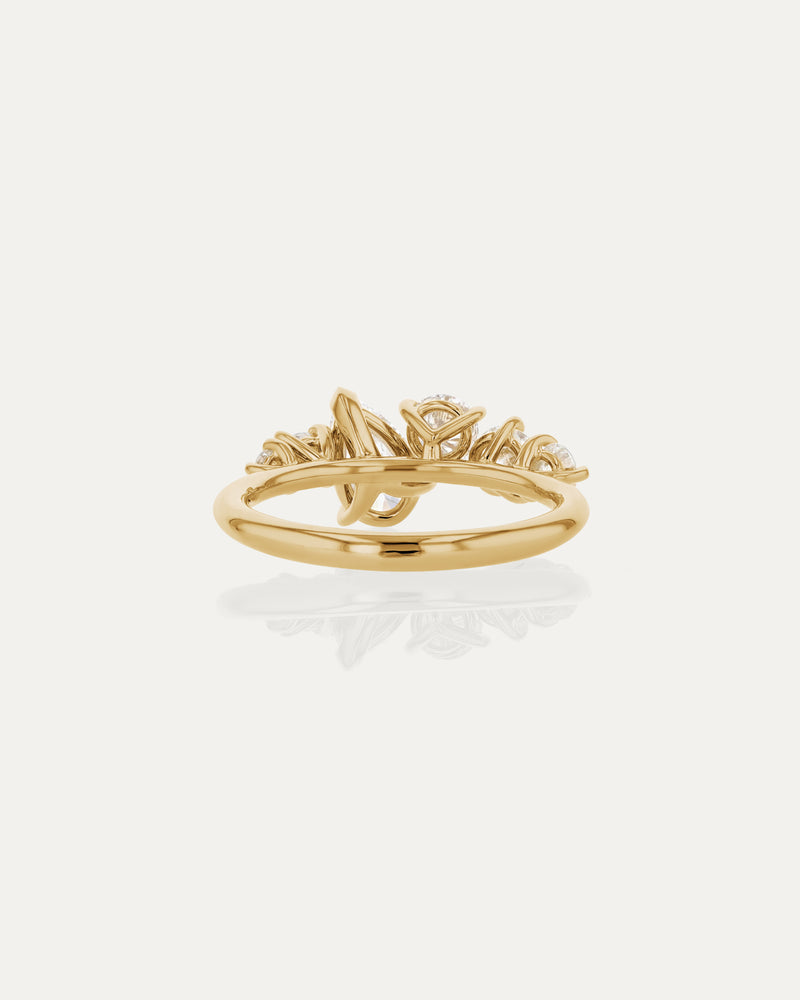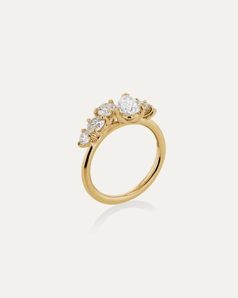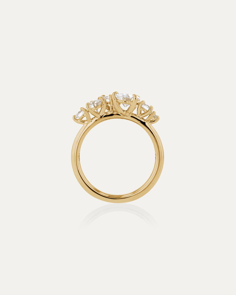 The Multi Diamond Engagement Ring is mirroring a classic claw setting all the way along its front perspective. The pear accent, with round brilliant diamonds is a formative design consideration in this bespoke piece, poised with sparkle. All elements of this ring including alloy, carat and colour can be made bespoke as per your budget and request.