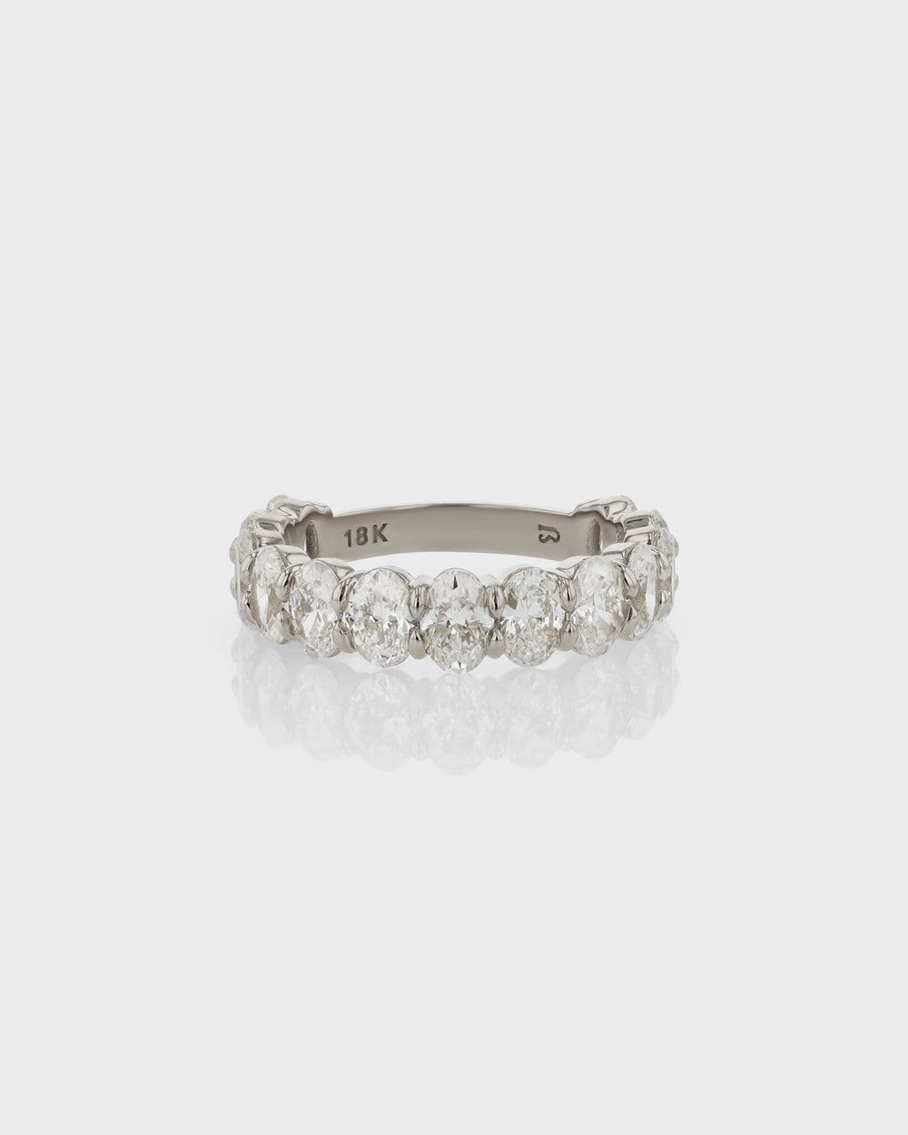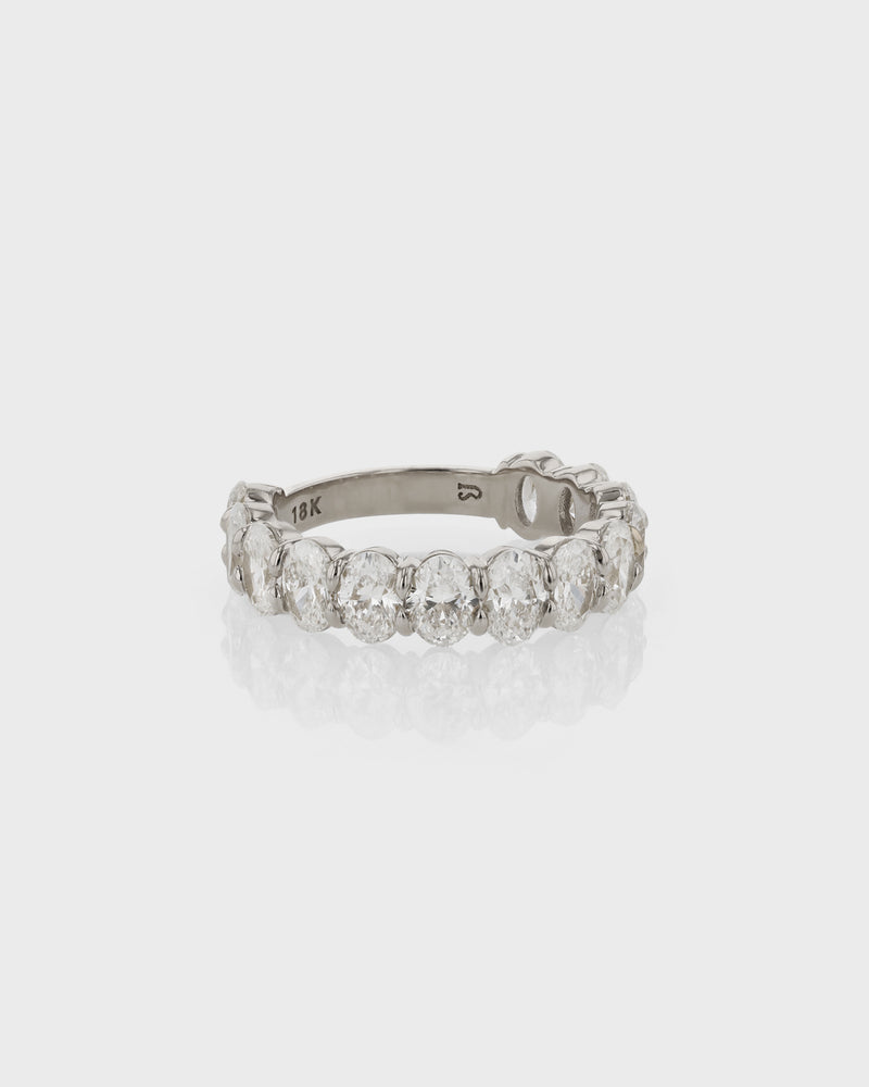A sophisticated modern wedding band or a standout piece to treasure forever, this ring features a uniform cluster of oval diamonds set vertically along 3/4 of an 18-karat gold band.