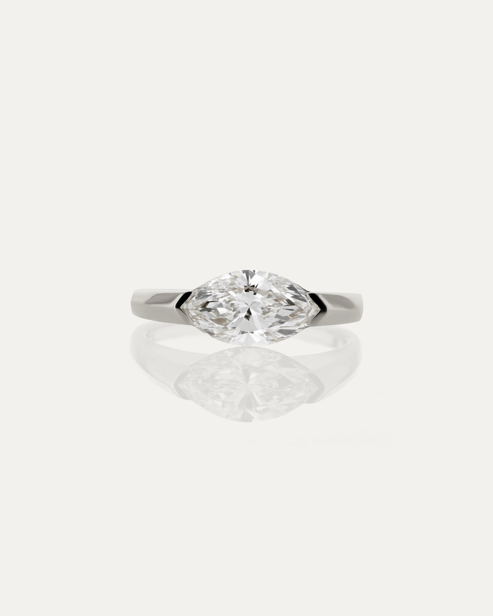 The SuspenseMarquise Ring takes its inspiration from a tension style setting, creating the illusion of a floating diamond, horizontally set on thick tapered band. Experiment with design details that make up a SARAH & SEBASTIAN Engagement Ring. Elements of this ring including band metal, carat and colour can be made bespoke as per your request. From price is based on a 0.5ct, F colour and VS2 clarity diamond on a 18k gold band.