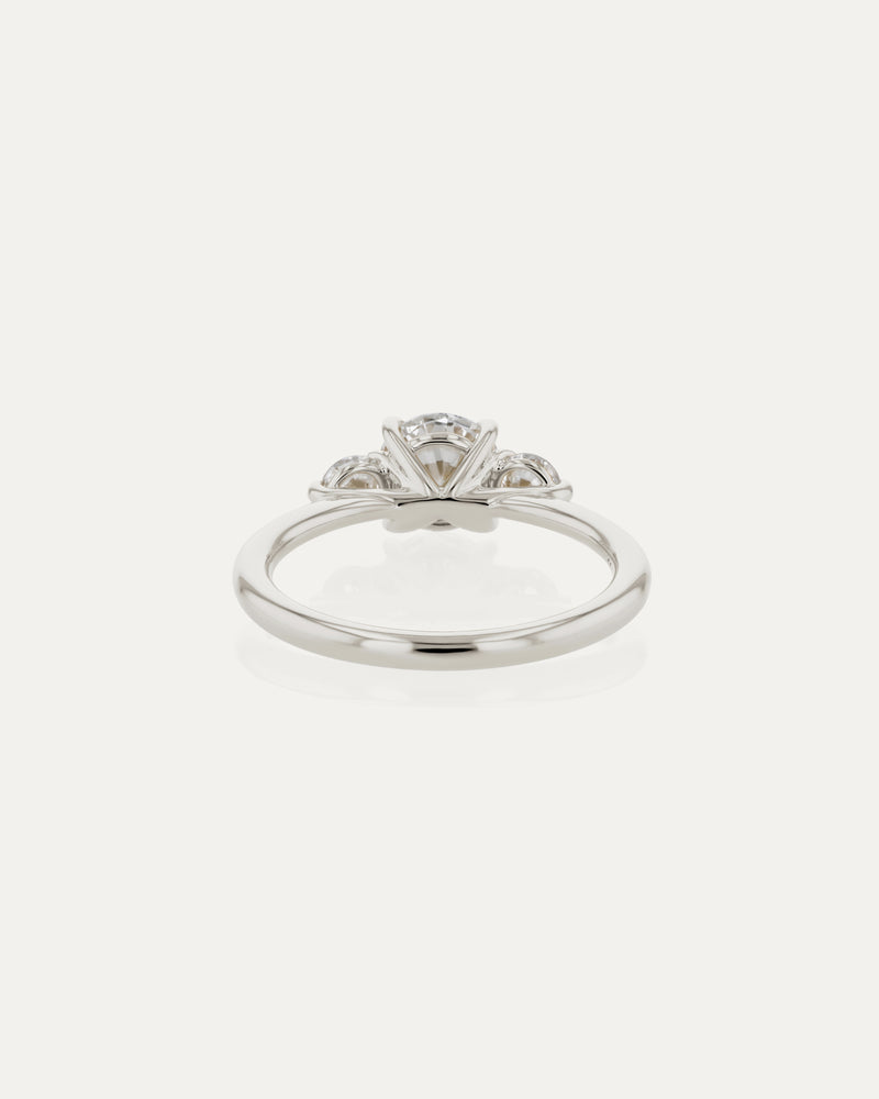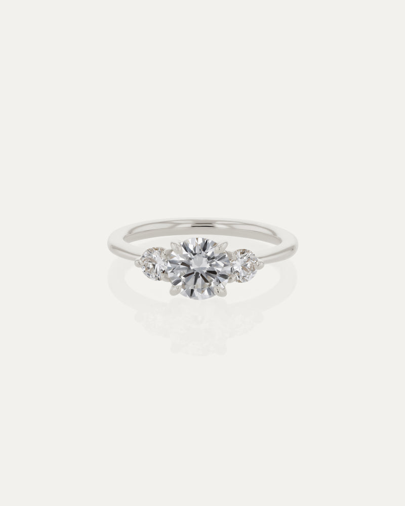 Experiment with design details that make up a SARAH & SEBASTIAN Engagement Ring. The Trilogy Round Engagement Ring features a round brilliant diamond alongside two complementing shoulder stones. All elements of this ring including band style, metal, carat and colour can be made bespoke as per your budget and request.