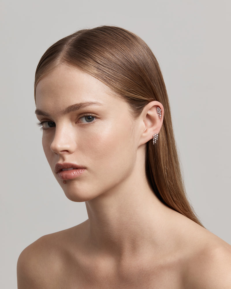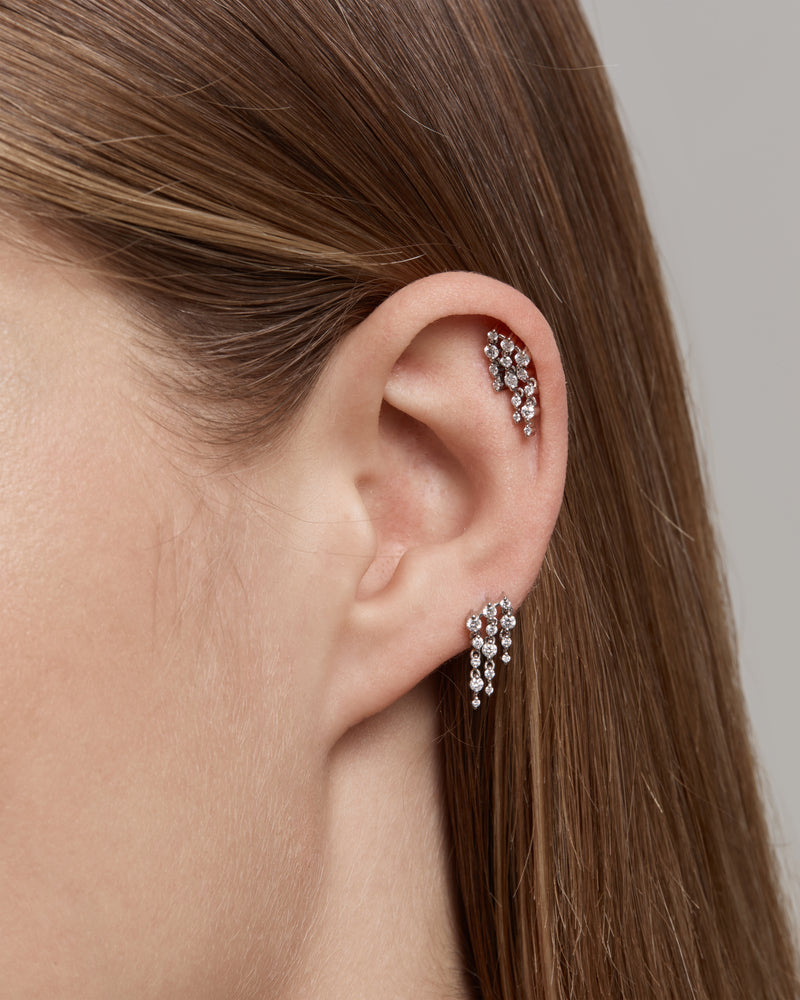 Featuring cascading diamonds constructed to flow with the curvatures of the ear, the Urchin Cartilage Earring makes a statement with diamond tendrils that sway with every movement. Crafted in platinum, this piece is embellished with 14 round white diamonds.