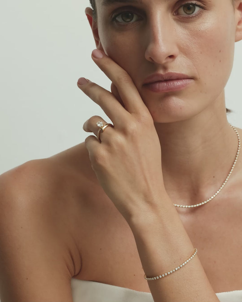 Aria Oval Engagement Ring features a delicate peppering of pavé diamonds along one half of the band. Embodying a sweet embrace, this piece is a testament to eternal connection, love and unity.