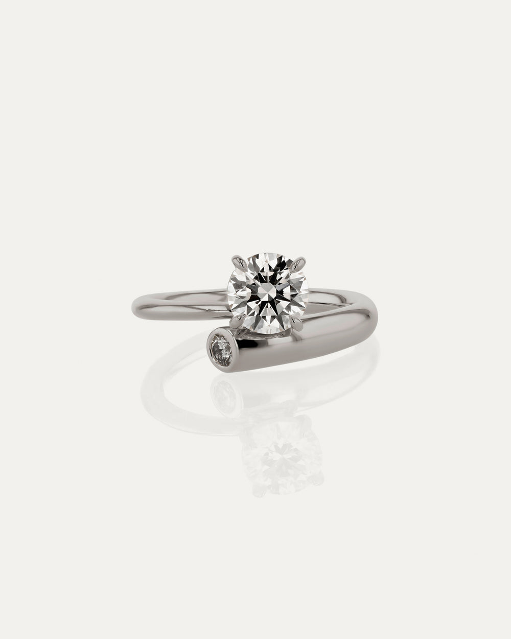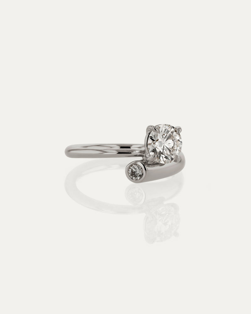 An evolution of the classic Toi et Moi ring, the Aria Round Engagement Ring champions a timeless floating round diamond with a wrapped 18-karat white gold or platinum band that follows the shape and form of a matching round accent diamond.