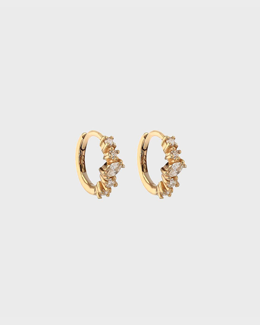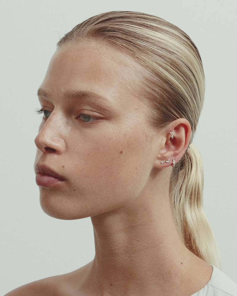A modern interpretation of the everyday hoop, the Fine Gossamer Hoop features marquise and round white diamonds in refined claw settings, illuminating our signature huggie silhouette with delicate sparkle.