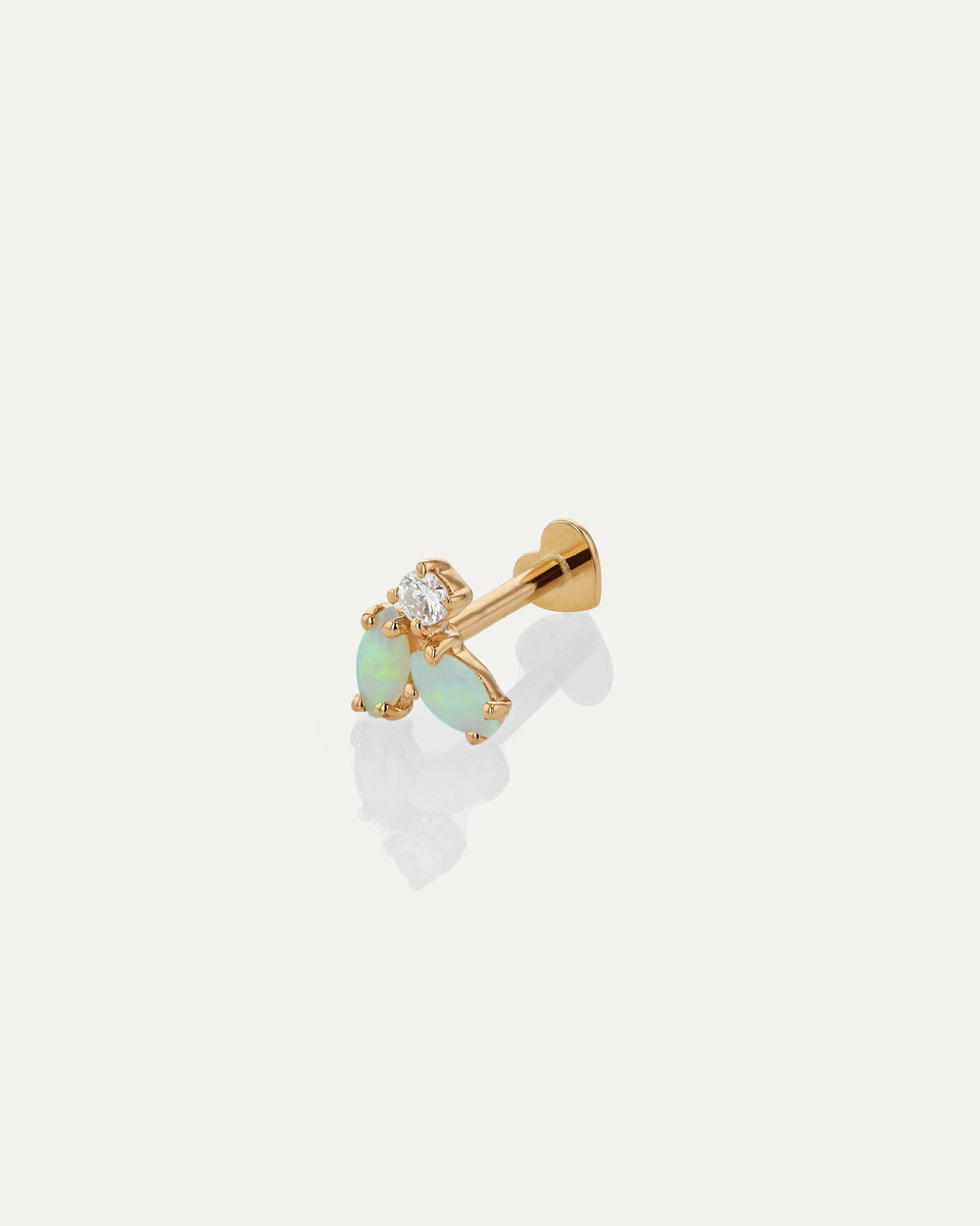 The Nymph Cartilage Earring is cast in 18-karat gold and features a striking wing cluster pendant, claw set with Australian marquise opal cabochons and a melee diamond. Our cartilage earrings can be worn in multiple areas of the ear, including the lobe, helix, conch, and daith. Note: As Opals are a naturally occurring stone they will differ from what is depicted online, with each being unique.