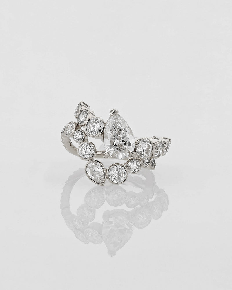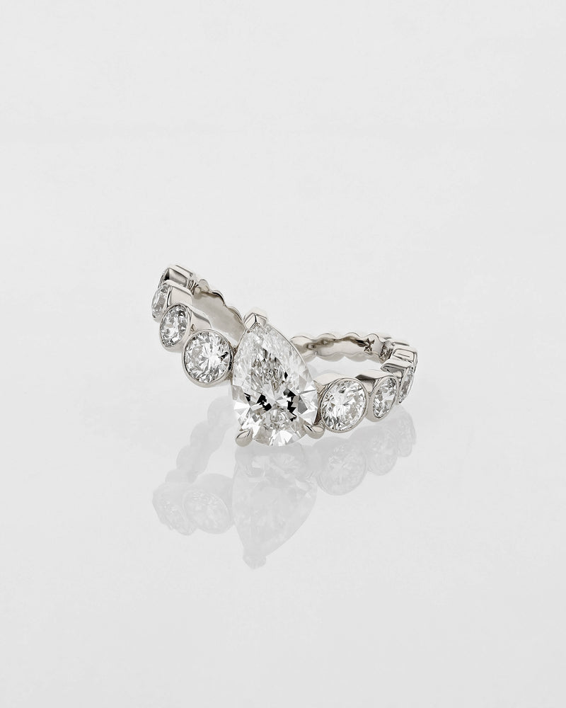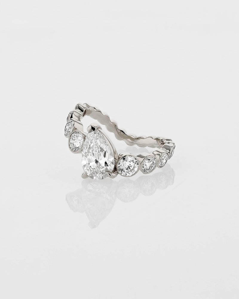 Evocative of a wave, The Ocean Engagement Ring features undulating bezel set diamonds, anchored with a solitaire pear. All elements of this ring including metal, diamond colour and diamond carat from 1ct and above can be made bespoke.
