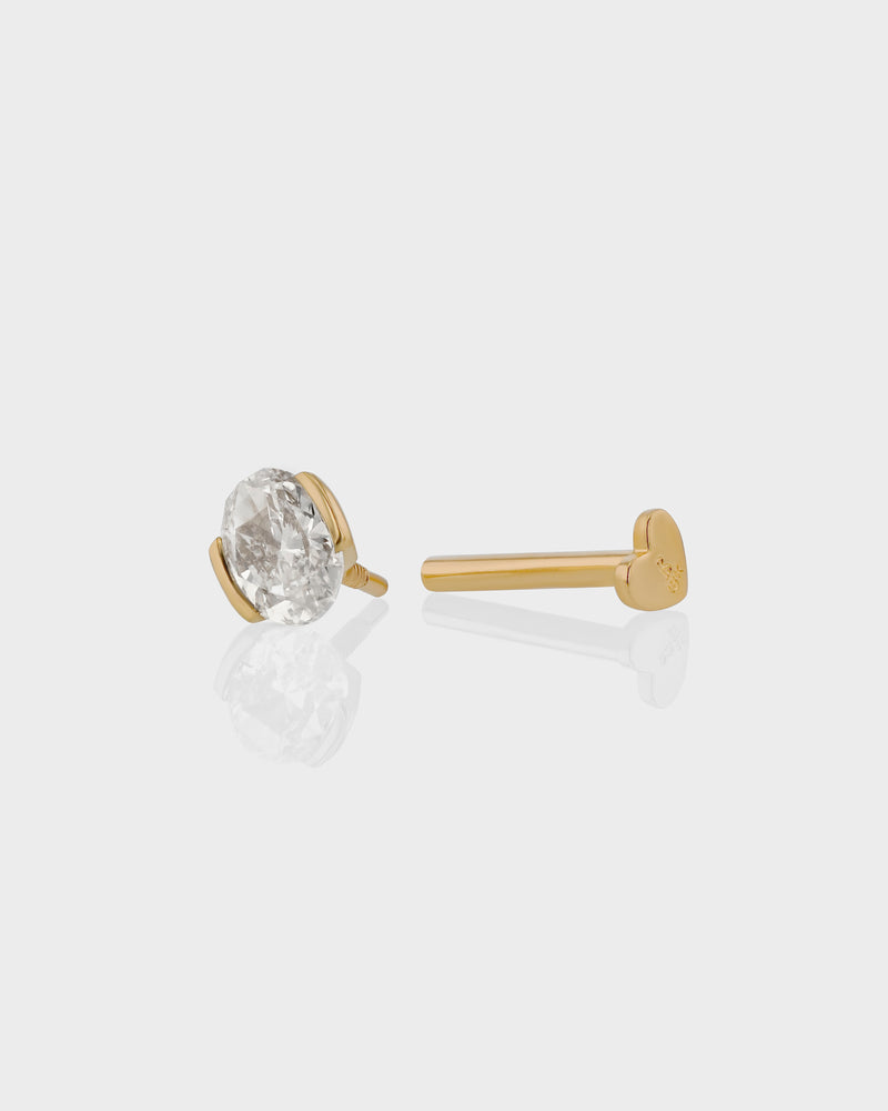 Build a brilliant Ear Alchemy with the Oval Suspense Cartilage Earring featuring an internally threaded post for smooth fit and comfort and our signature flat heart backing. Sold as a single piece, it heroes a 0.25-carat oval-cut natural diamond held in balance with our suspense-style setting.