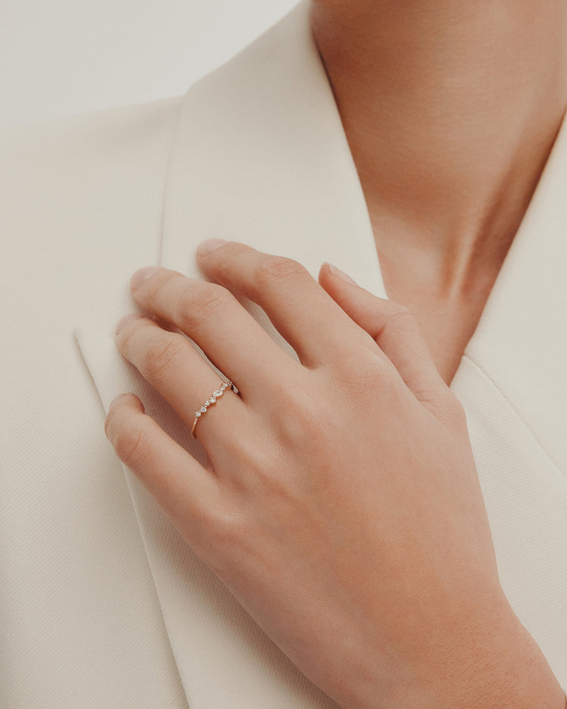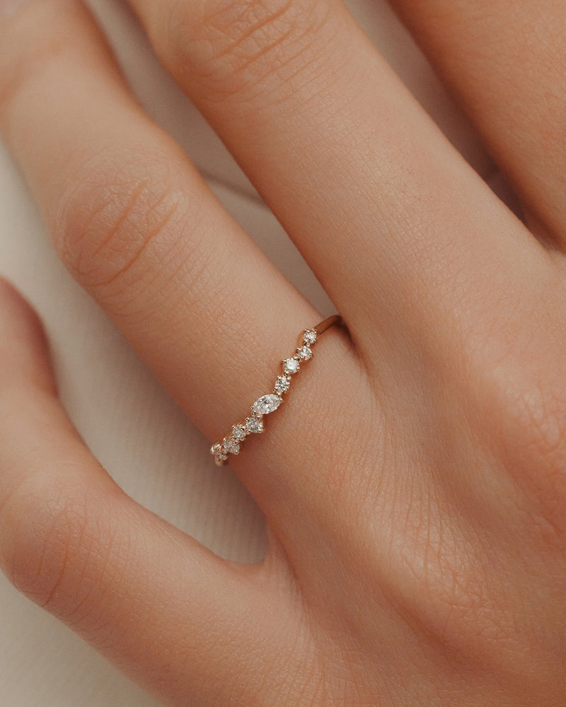 Creative Director Sarah Gittoes was inspired by the white foam of crashing waves when she designed the Fine Gossamer Ring. A marquise diamond is framed by round stones in an organic curved cluster, capturing the fluidity of the ocean in refined form.