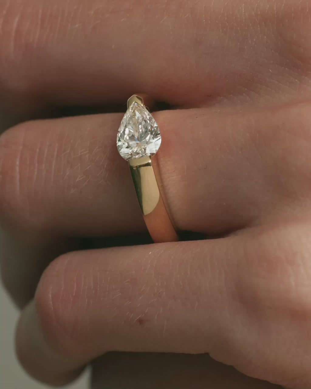 The SuspensePear Ring takes its inspiration from a tension style setting, creating the illusion of a floating diamond, horizontally set on thick tapered band. Experiment with design details that make up a SARAH & SEBASTIAN Engagement Ring. Elements of this ring including band metal, carat and colour can be made bespoke as per your request.