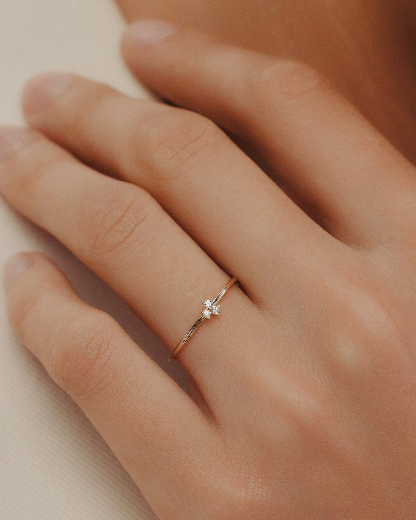 The Trio Diamond Ring is cast in solid 10-karat gold, and features white three diamonds claw set and fixed on a fine wire band. Elegant and minimal, the Trio Diamond Ring is sleek and small enough to complement any outfit, but can be dressed up by stacking it alongside other rings from the Sarah & Sebastian collection.