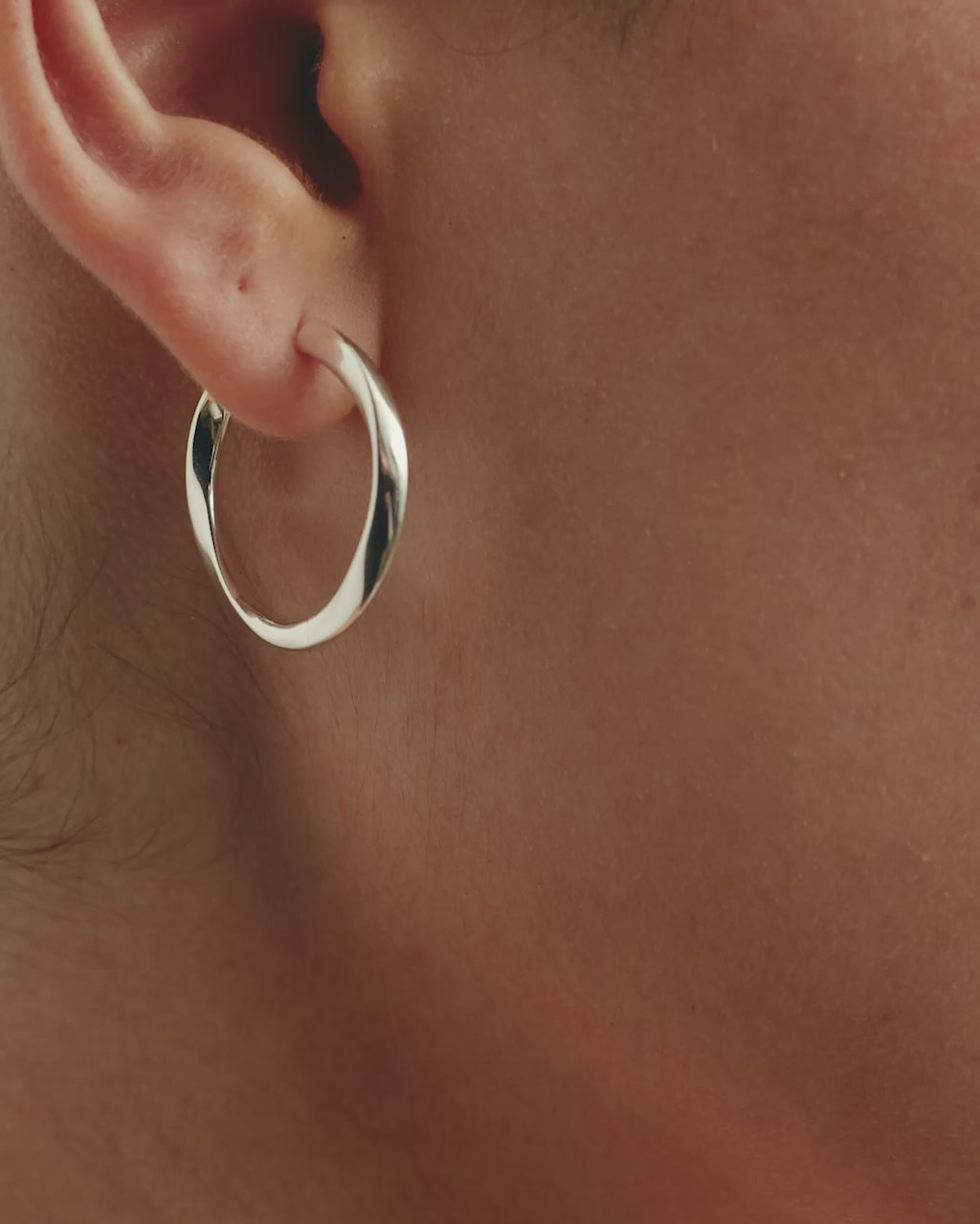 Handcrafted in sterling silver, the Twisted Pipi Hoops are shaped with gentle twists that bring a considered, architectural edge to any ear stack. Striking worn alone or layered, they add texture and movement to your look.