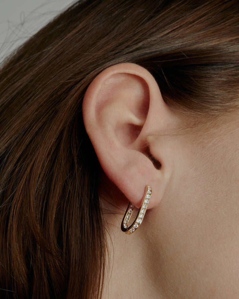 Our Diamond Channel Hoops are dazzling statement earrings, featuring 2mm white diamonds along thick white or yellow gold hoops. While all of Sarah & Sebastian’s earrings are designed with stacking in mind, the Diamond Channel Hoops make a bold statement all on their own.