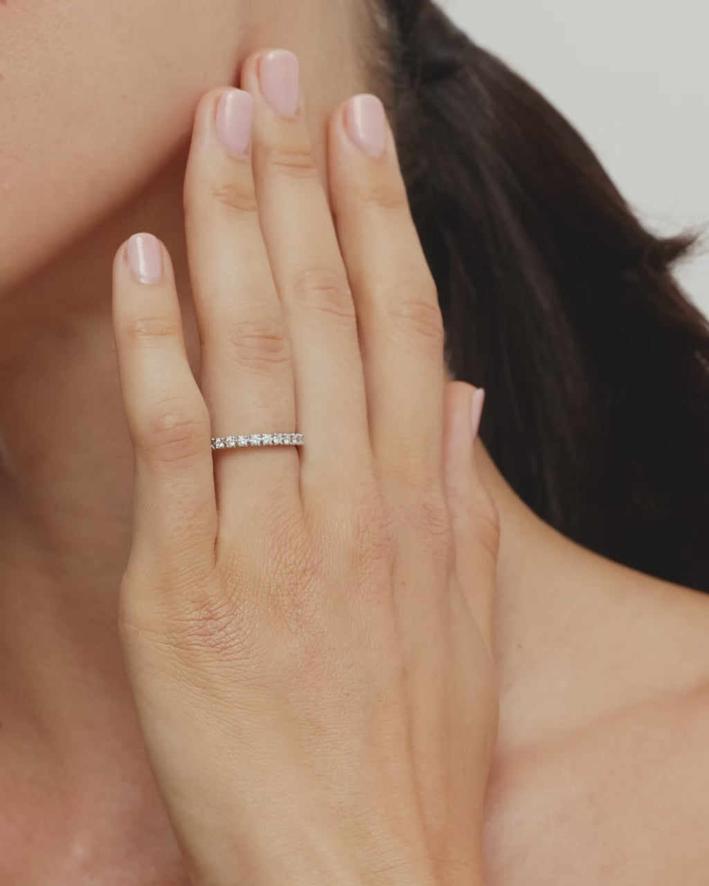 The perfect addition to your engagement stack, our Eternity Diamond II Ring is available in 10-karat or 18-karat gold and features a delicate string of white diamonds claw set three quarters of the way around a 2.1mm band.