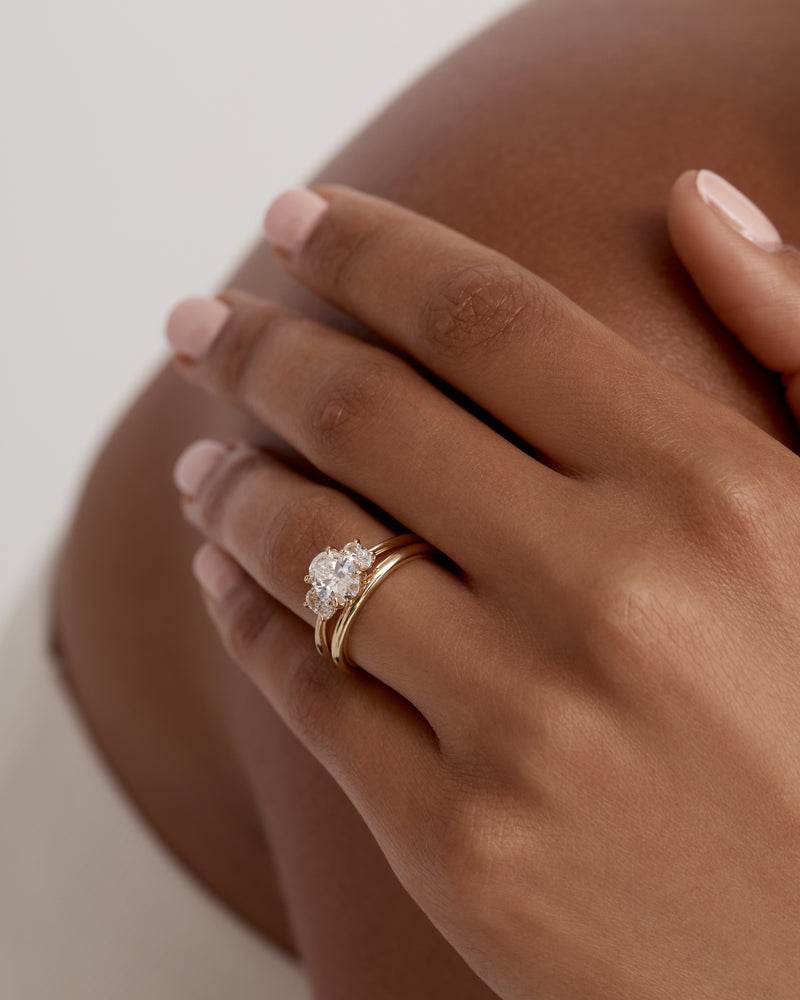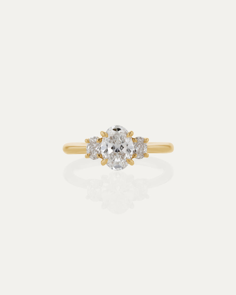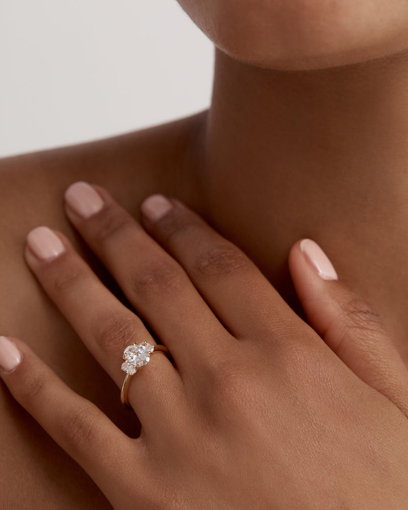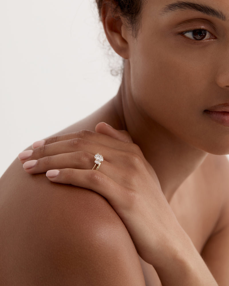 Experiment with design details that make up a SARAH & SEBASTIAN Engagement Ring. The Oval Trilogy Engagement Ring features a oval brilliant diamond alongside two complementing shoulder stones. All elements of this ring including band style, metal, carat and colour can be made bespoke as per your budget and request.