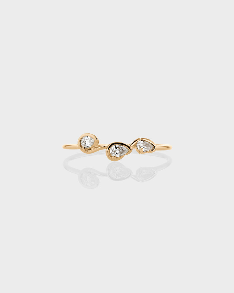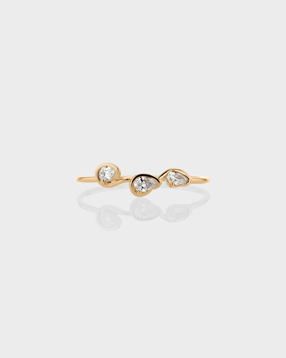 Tracing migratory lines, wrapped around three petite pear-shaped diamonds, each setting in the Petite Diamond Corridor Ring is choreographed at varying heights, capturing the movement of a majestic whale pod drifting through the water. An elevated ring for everyday, with an organic curved silhouette, this piece can be worn on its own or layered with other fine rings and statement rings from the SARAH & SEBASTIAN collection.