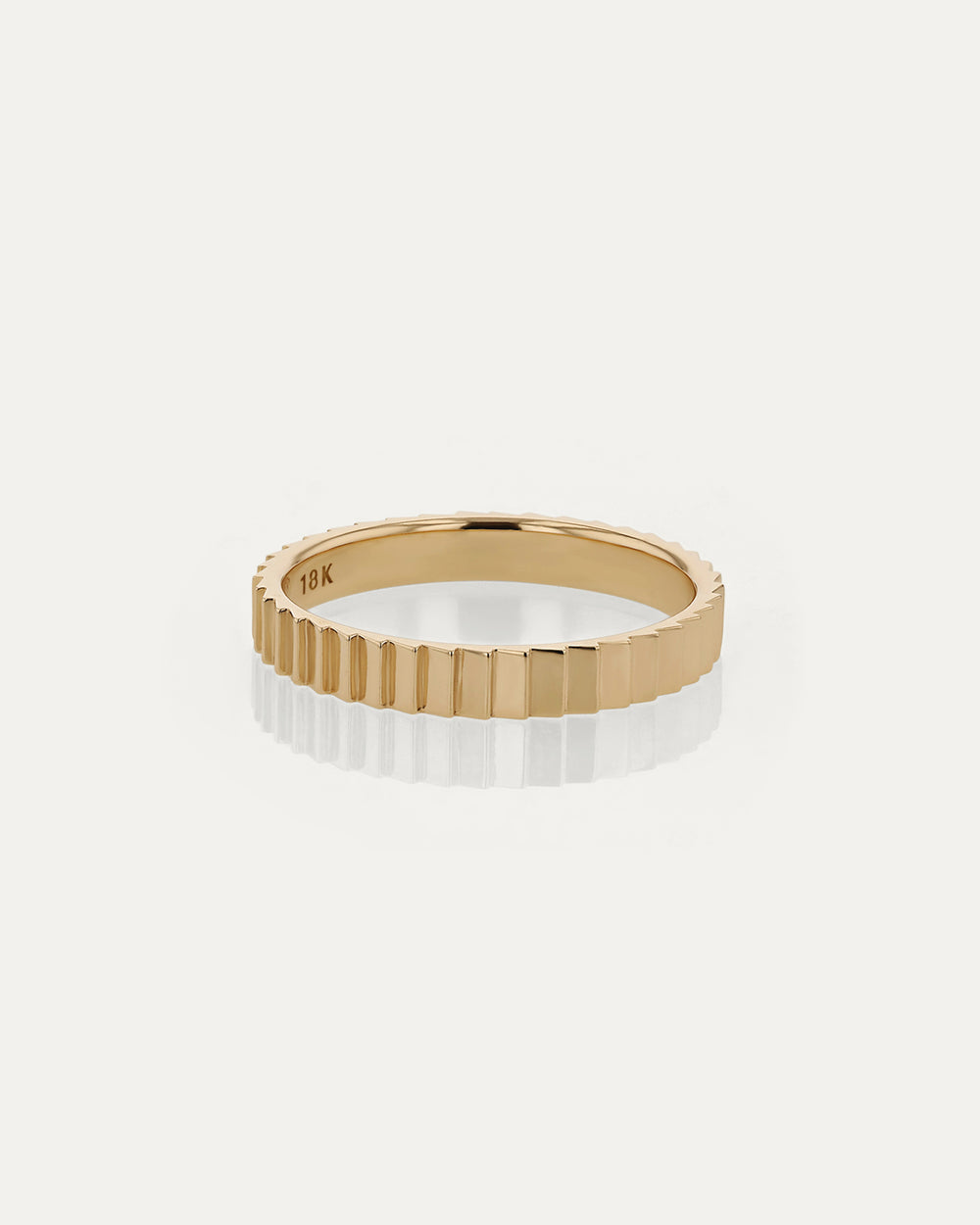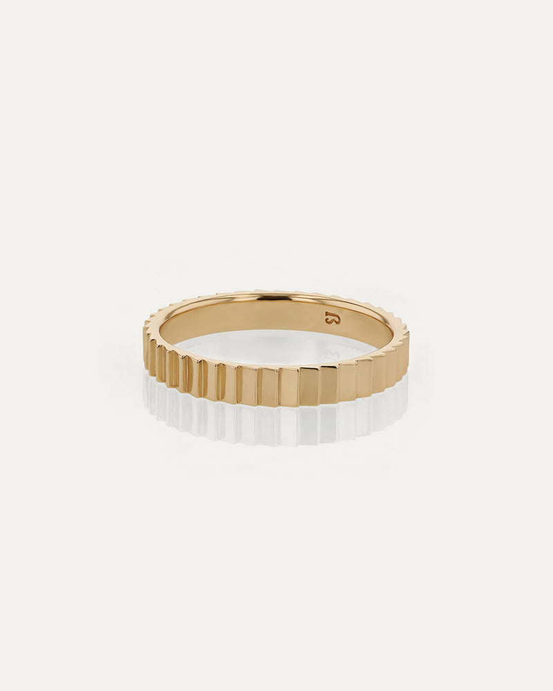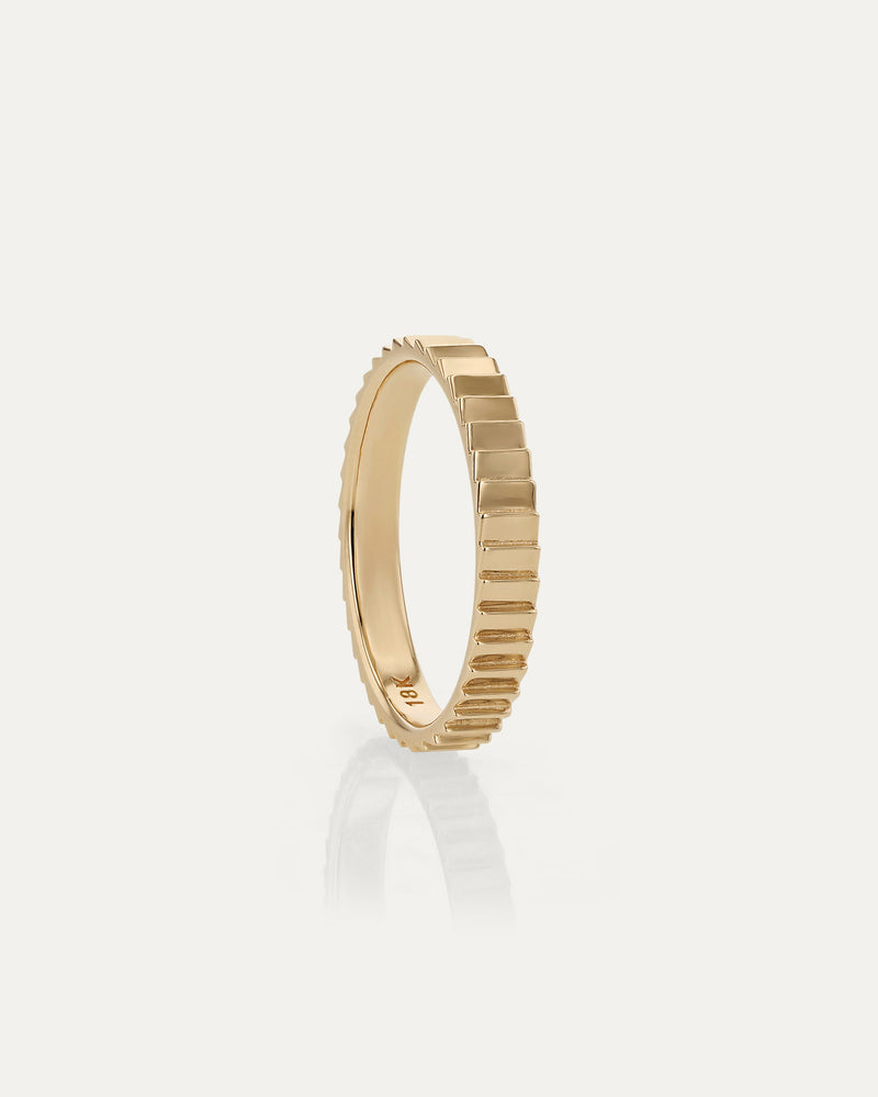 Featuring a repetitive scale pattern that gives off a kinetic illusion when exposed to light, the Scale Ring is a bold everyday piece to layer with other fine and embellished rings from the Sarah & Sebastian collection. Wear it with the Scale Cuff and Scale Hoops to complete a matching set.