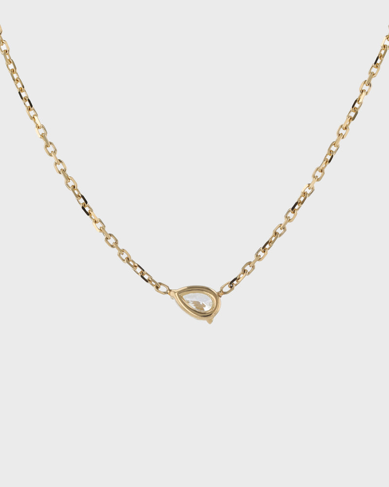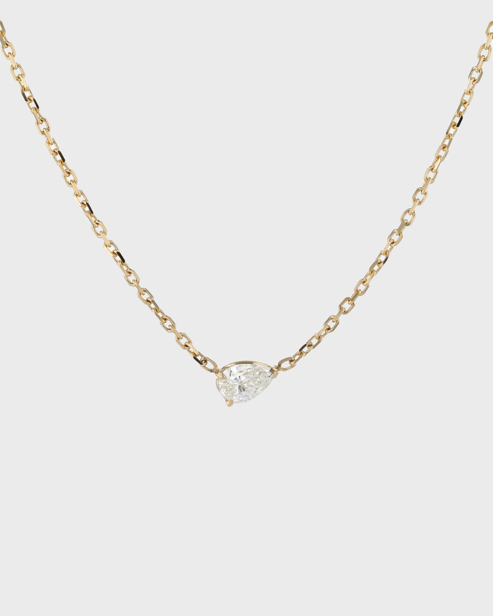 Our Solitaire Pear Diamond Necklace is strung with a dainty round cut diamond. Cast from solid 18-karat gold, it's suspended from our signature bold chain. A piece so delicate it gives the appearance of ‘floating’ on the neckline, let this piece speak quiet volumes on its own, or layer it with other fine necklaces from your collection.