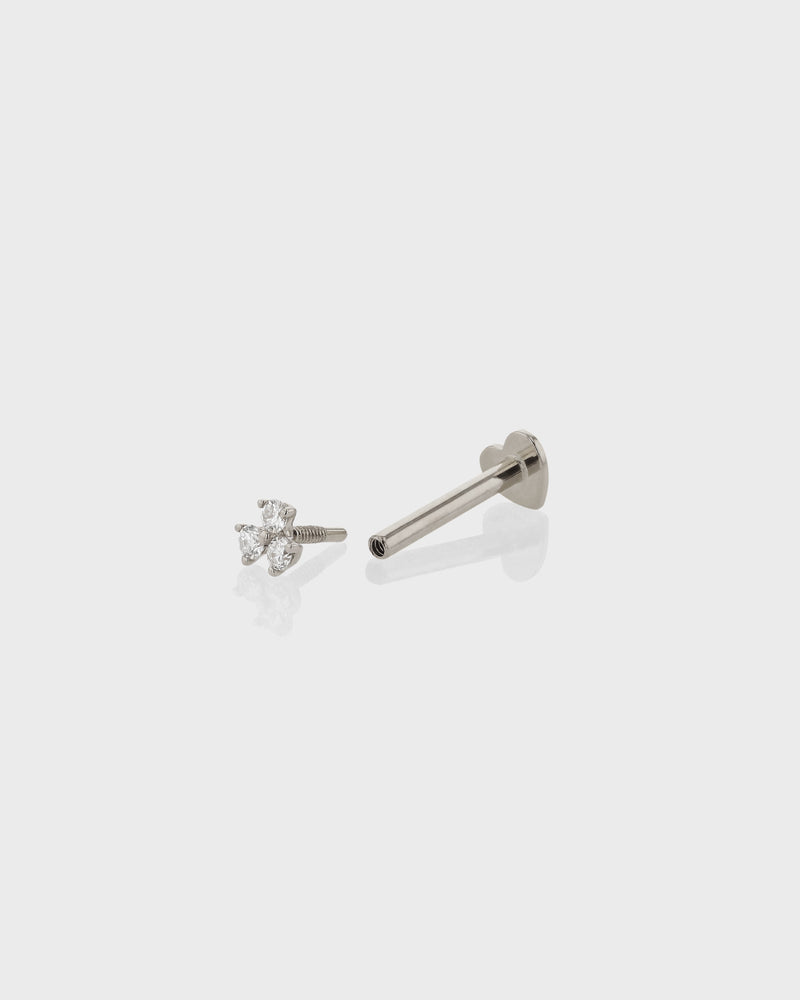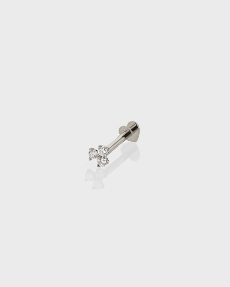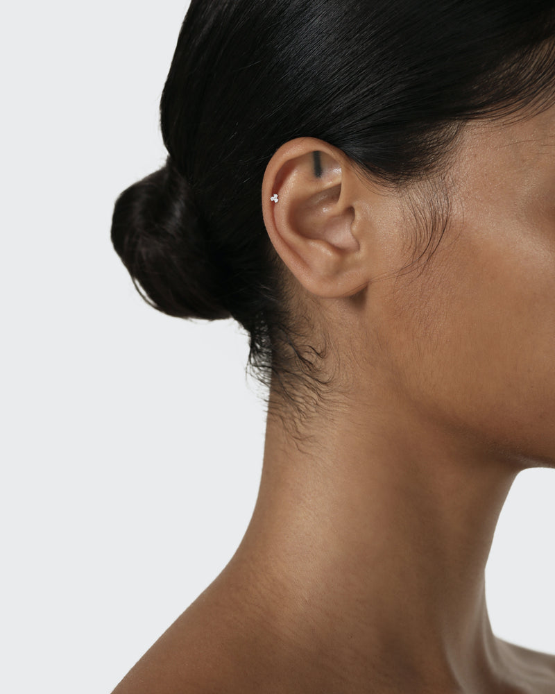 The Trio Diamond Cartilage Earring takes our signature Trinity design and elevates it with a trio of white diamonds set in a minimal platinum setting. Designed for the cartilage, this single stud can be worn anywhere in the ear from the helix to the conch, and looks best when stacked along the ear with other earrings from our collection.