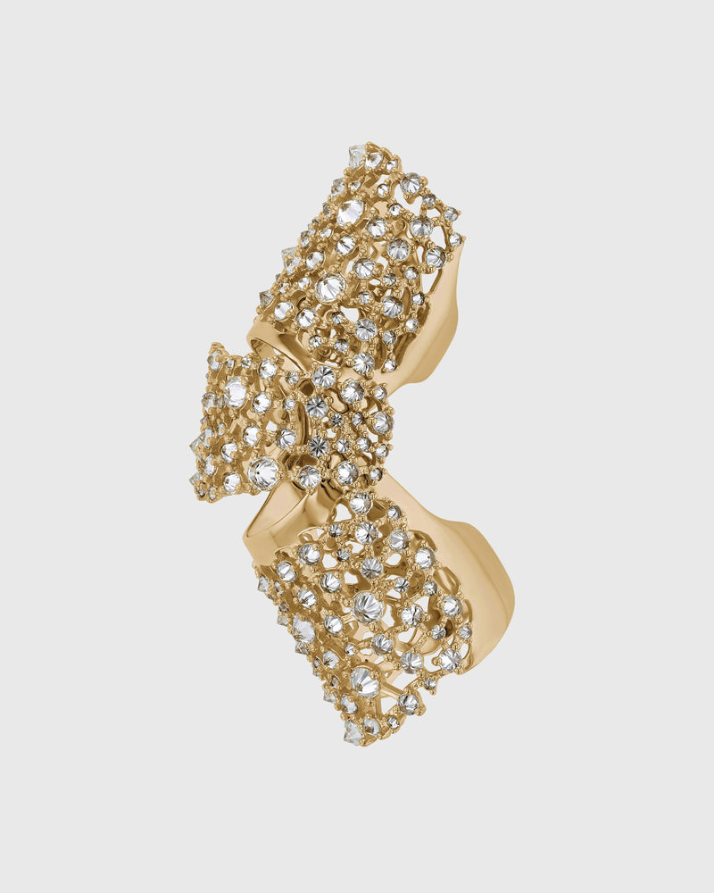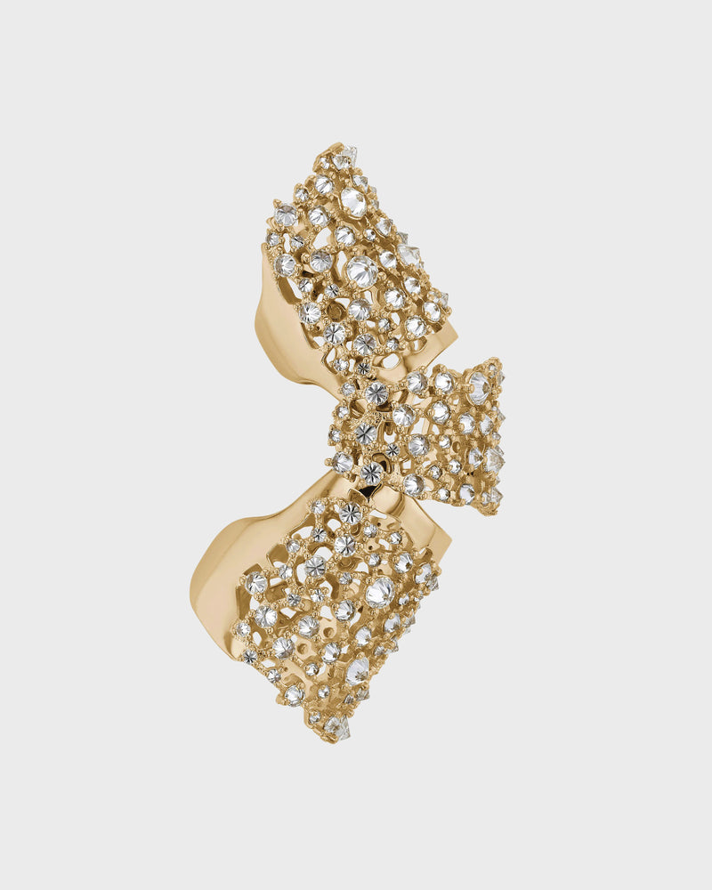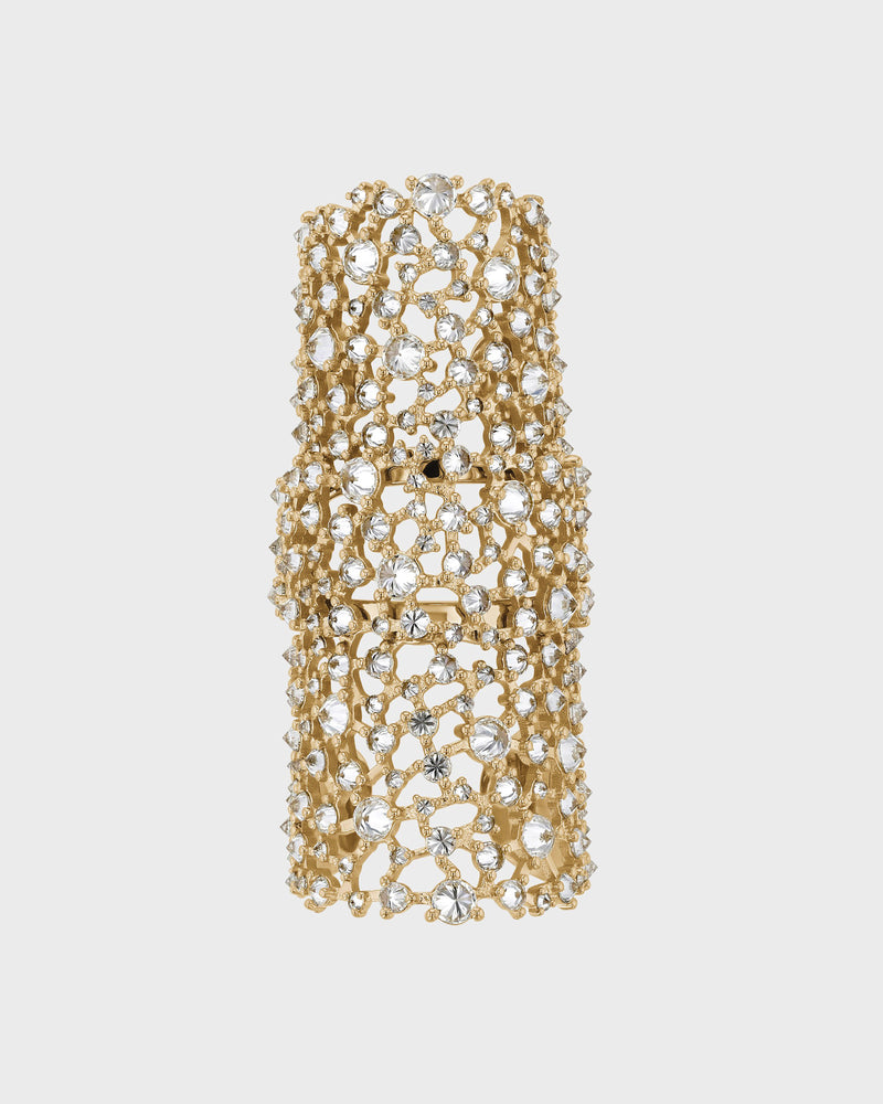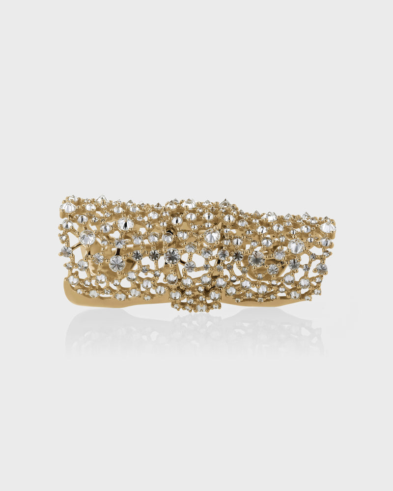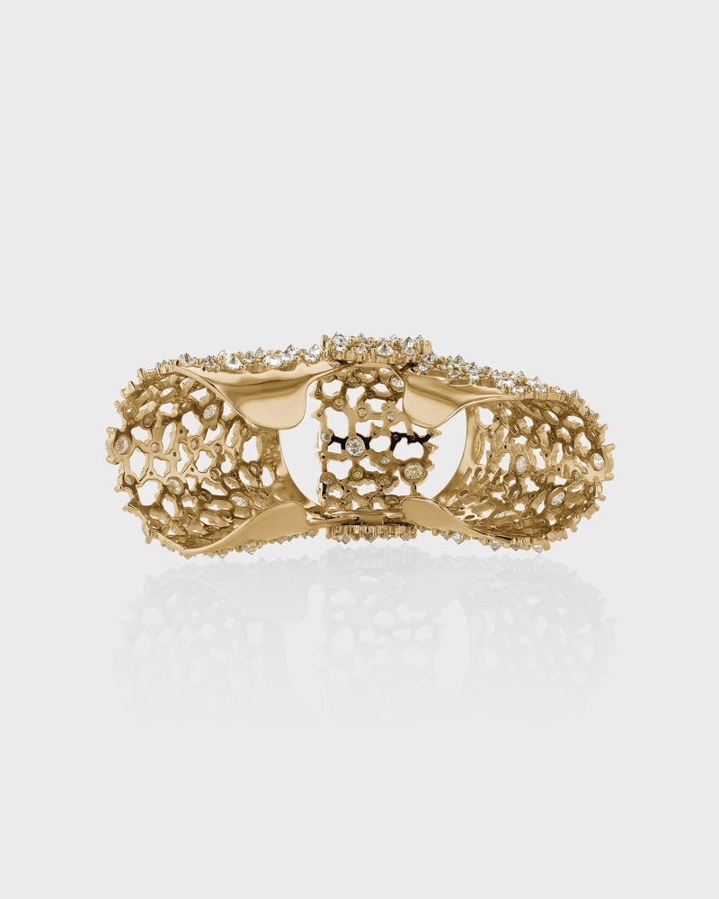 A sculptural statement ring inspired by the globular Sea Urchin, the Urchin Lace Armour Ring is uniquely designed to sit across the length of the finger. Handcrafted in 18-karat gold, it features a labyrinth of over 200 white diamonds, each artfully inverted in their settings to create unfamiliar textures that hint at the creature's spikey contours. Lace-like in appearance yet armour-like in structure, this elaborate piece captures an aura of femininity while speaking to resilience and protection.