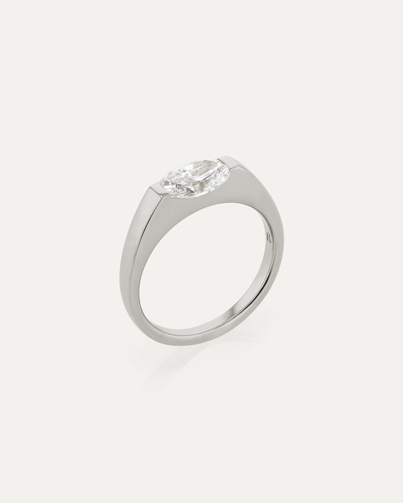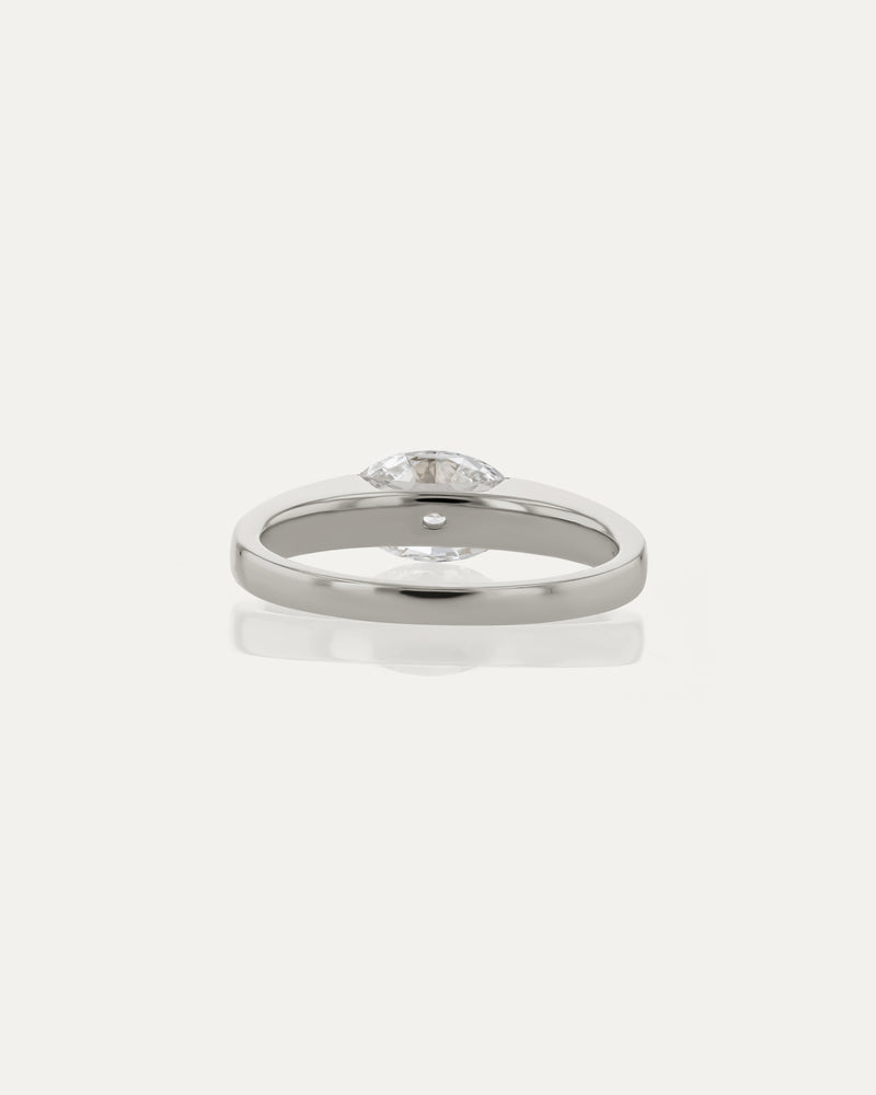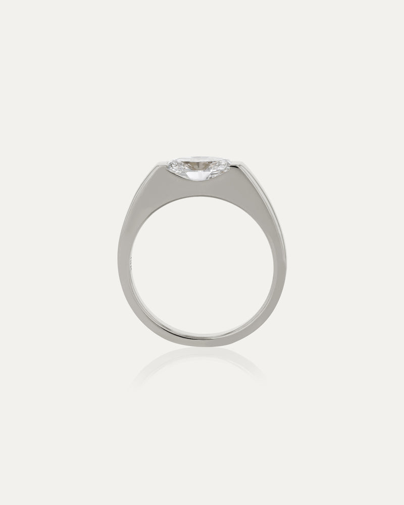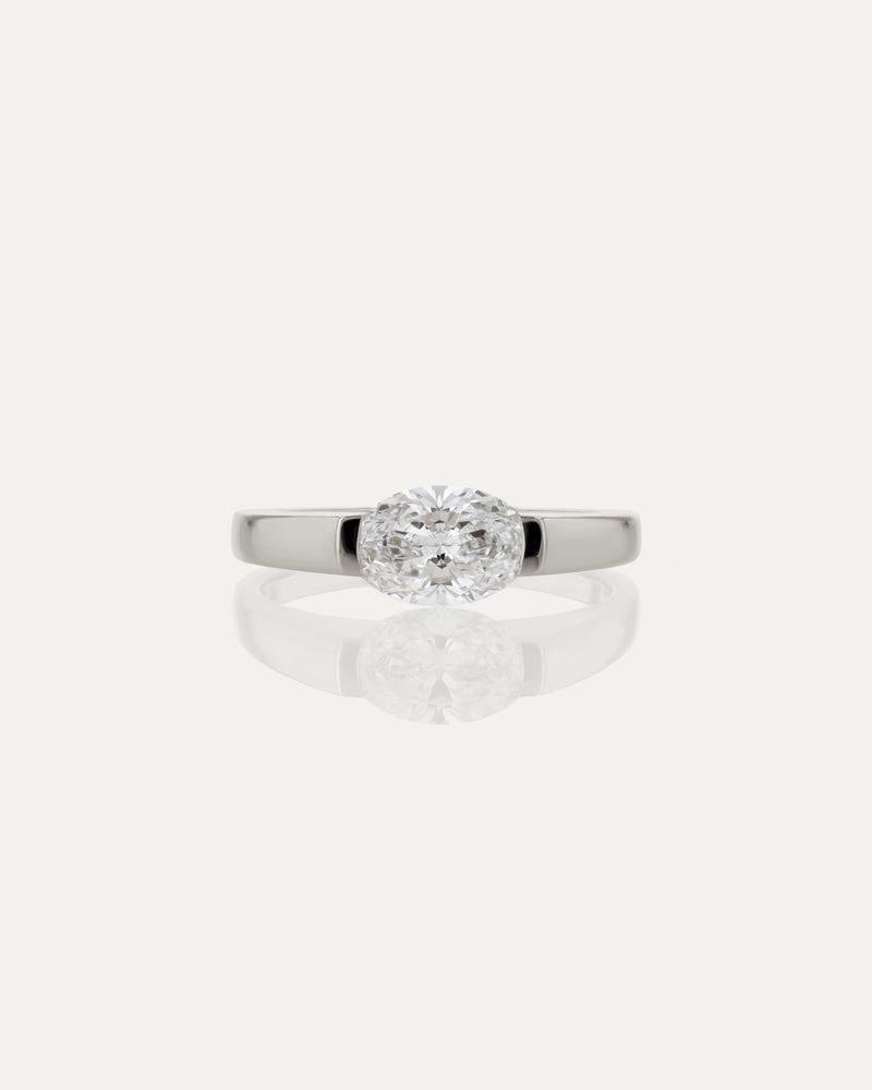 The SuspenseOval Ring takes its inspiration from a tension style setting, creating the illusion of a floating diamond, horizontally set on thick tapered band. Experiment with design details that make up a SARAH & SEBASTIAN Engagement Ring. Elements of this ring including band metal, carat and colour can be made bespoke as per your request. From price is based on a 0.5ct, F colour and VS2 clarity diamond on a 18k gold band.