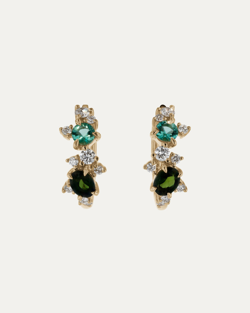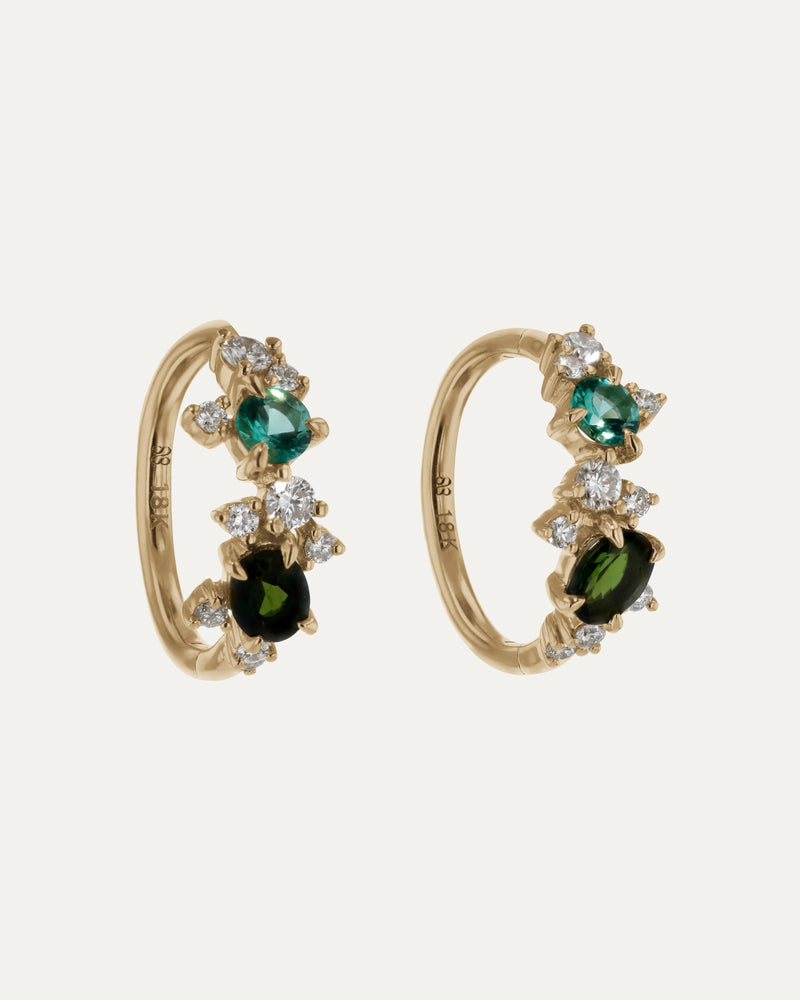 Echoing the green hues of verdigris patination with natural emeralds and tourmalines, the Verdigris Cluster Hoops are intricate pieces for elevated ear styling.