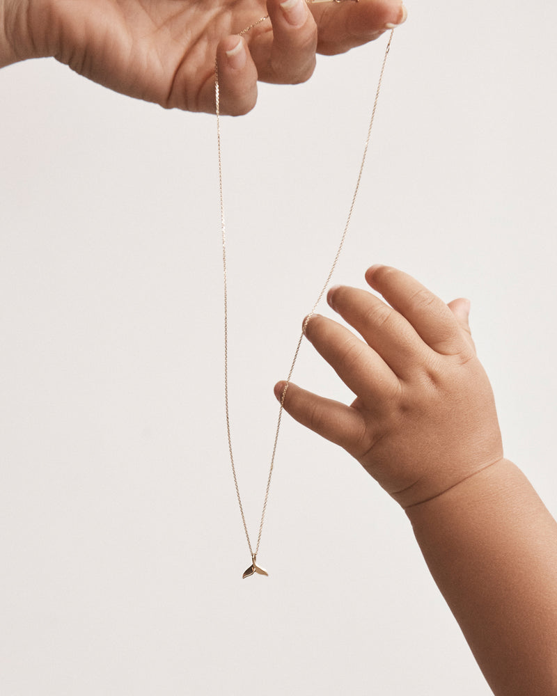 Crafted in 18-karat yellow gold, the Petite Whale Necklace is a minimalist sculpted design echoing the three-dimensional form of a majestic whale fluke as it emerges from the rolling waves and spins in a captivating dance.