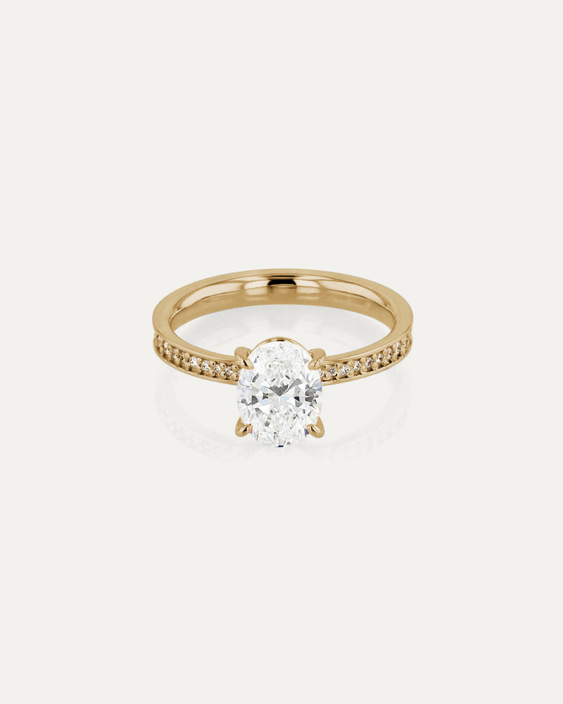 Experiment with design details that make up a SARAH & SEBASTIAN Engagement Ring. The Oval Channel Eternity Ring features an oval cut diamond on a claw set diamond band. All elements of this ring including band style, metal, carat and colour can be made bespoke as per your budget and request.