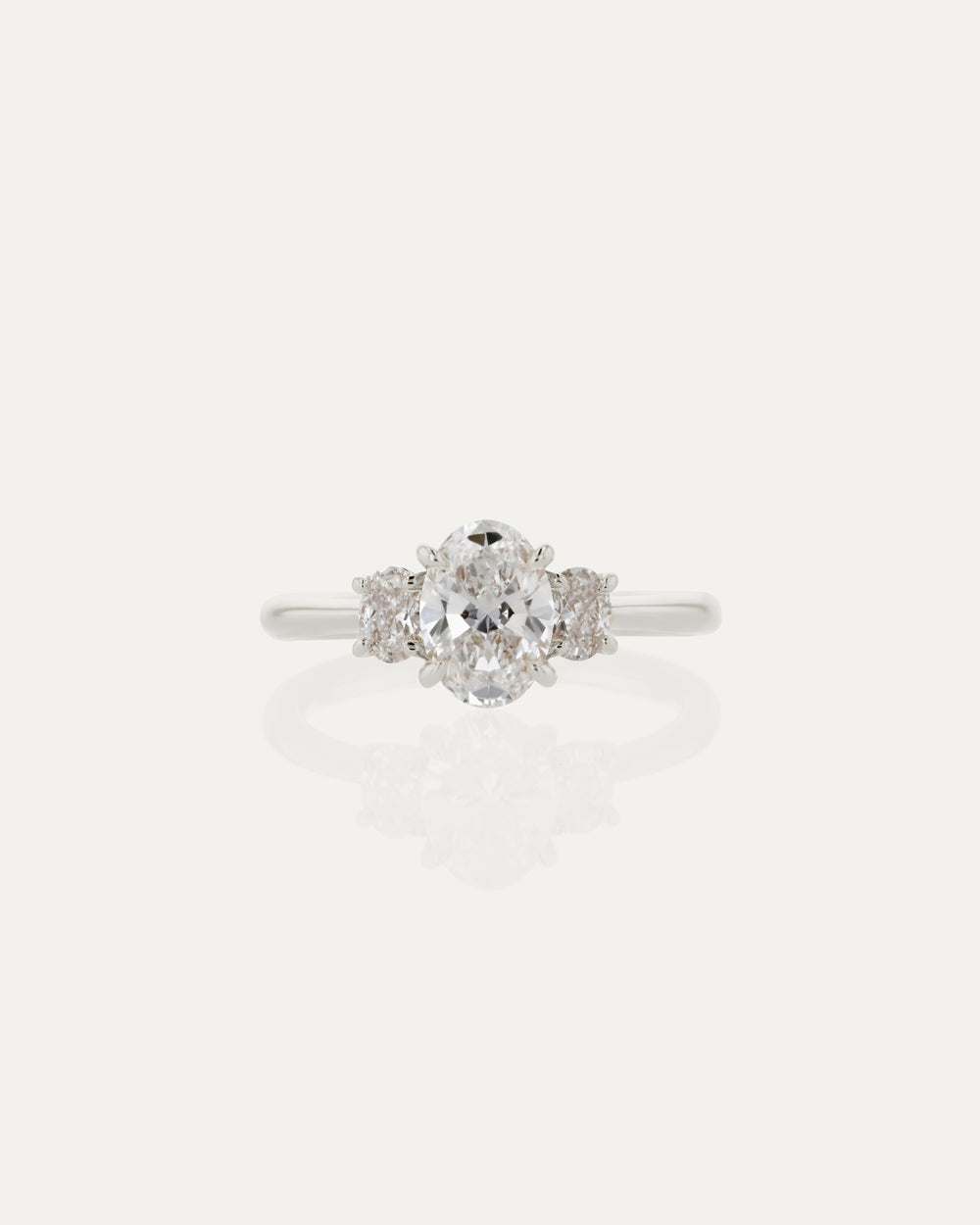 Experiment with design details that make up a SARAH & SEBASTIAN Engagement Ring. The Oval Trilogy Engagement Ring features a oval brilliant diamond alongside two complementing shoulder stones. All elements of this ring including band style, metal, carat and colour can be made bespoke as per your budget and request.