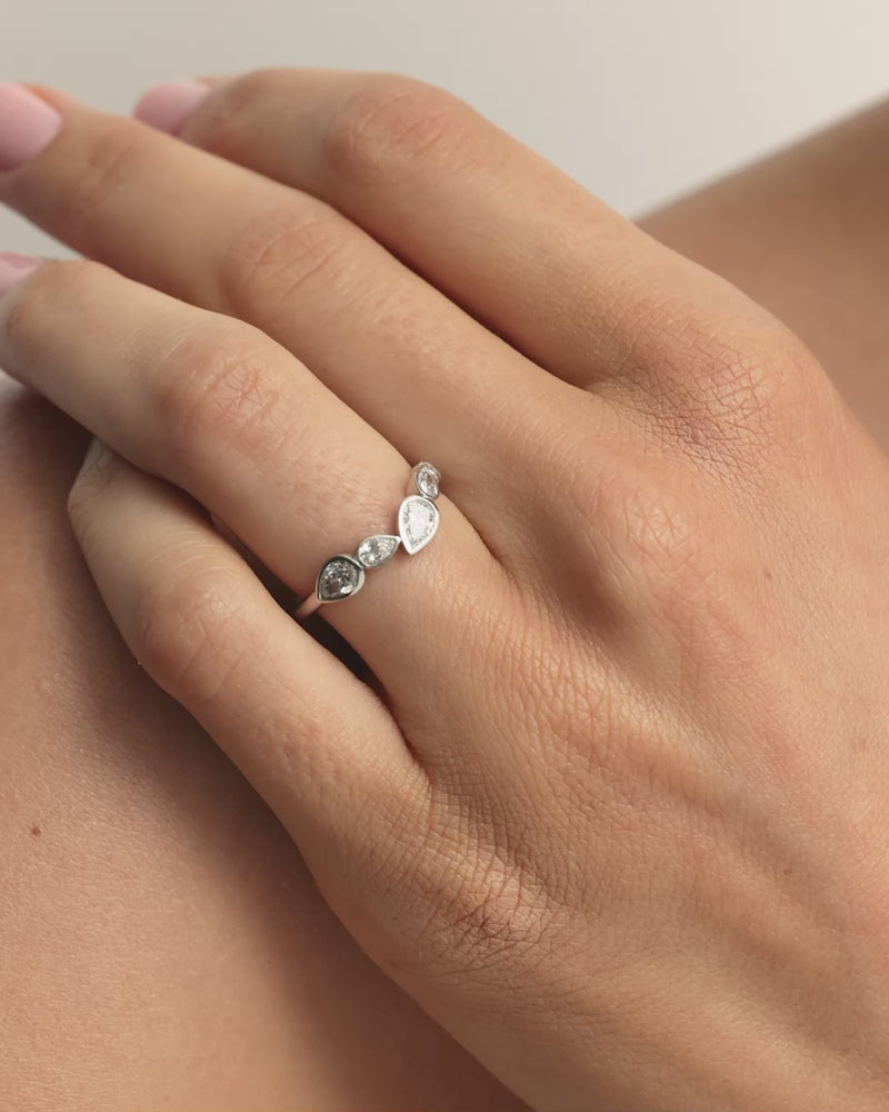 With a soft, undulating silhouette, the Pear Bezel Wave Ring makes for a unique wedding band or statement piece. Handcrafted in 18-karat gold, this standout ring champions five bezel-set natural pear diamonds in varying sizes, with an unconventional design drawing inspiration from rolling ocean waves. Pair it with our signature solitaire diamond engagement rings for effortless sophistication.