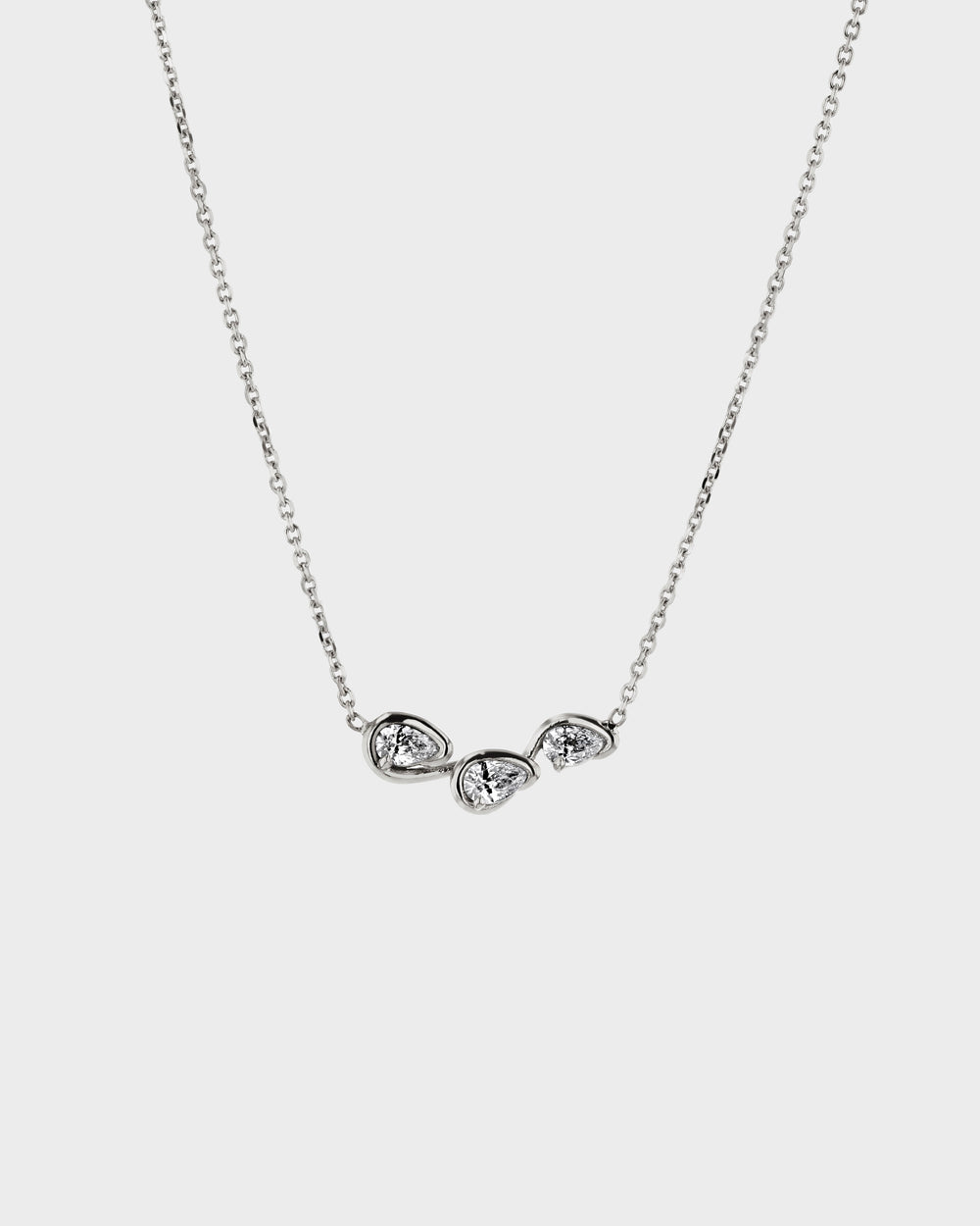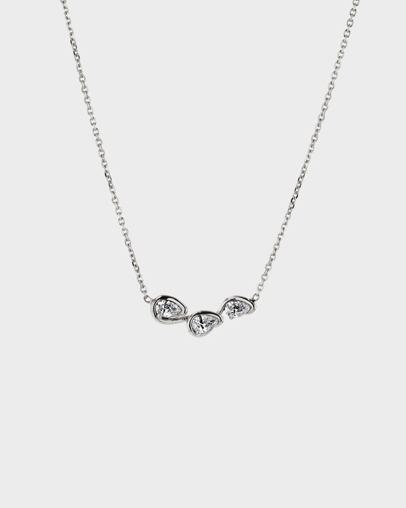 Tracing migratory lines, wrapped around three petite pear-shaped diamonds, each setting in the Petite Diamond Corridor Necklace is choreographed at varying heights, capturing the movement of a majestic whale pod drifting through the water. This elevated piece is designed for everyday layering with other fine bracelets, cuffs & bangles from the SARAH & SEBASTIAN collection.