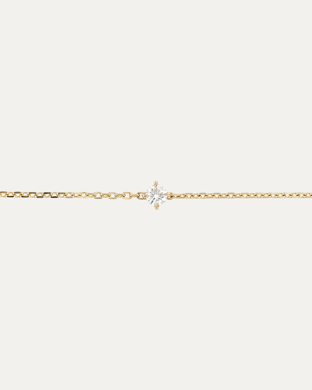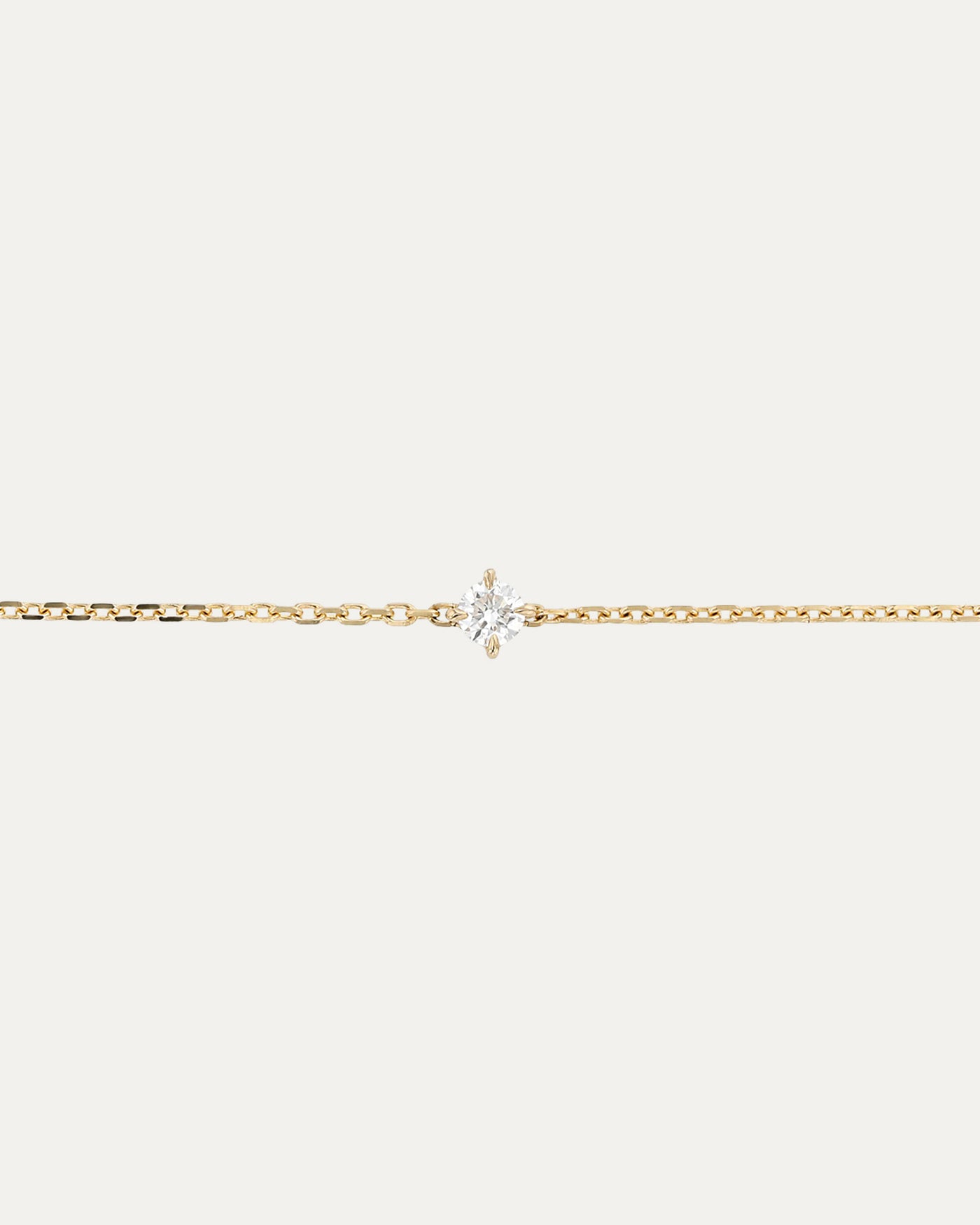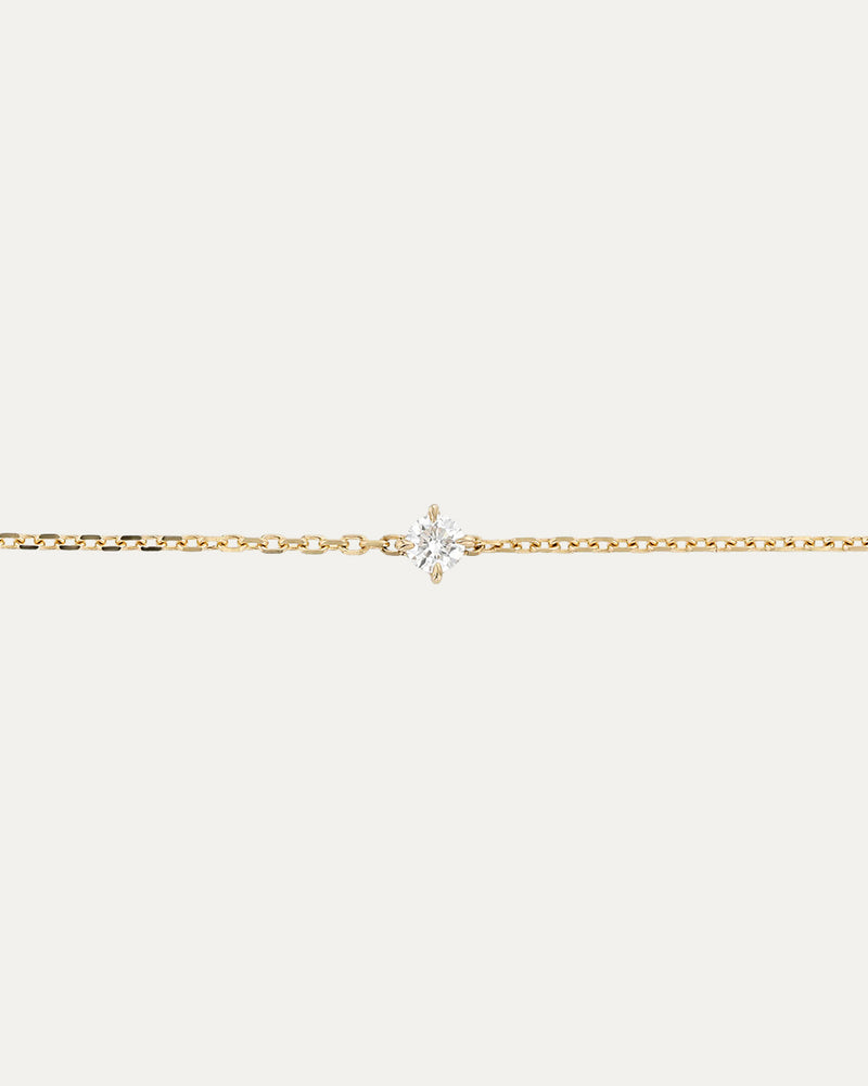 The Round Diamond Soldered Bracelet is a delicate piece featuring a fixed round white diamond set on our signature 18-karat yellow gold fine chain.