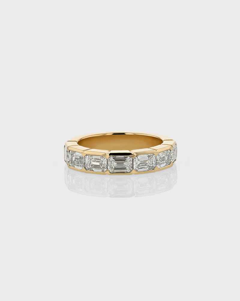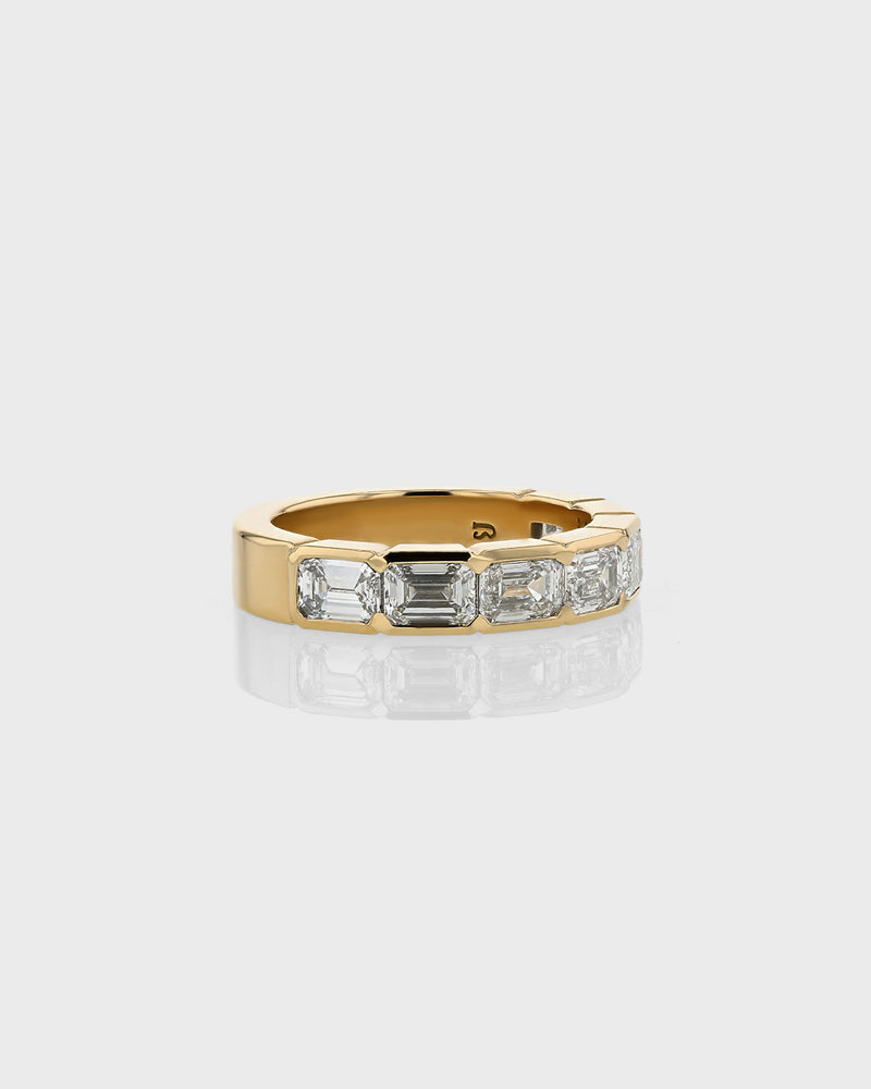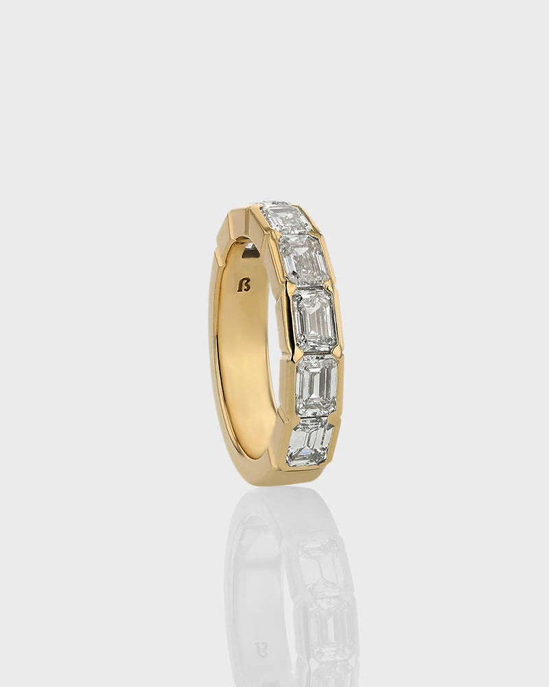 A sleek and polished wedding band or elevated layering piece featuring uniform emerald-cut diamonds set horizontally along 3/4 of an 18-karat gold band in a tension-style suspense setting.