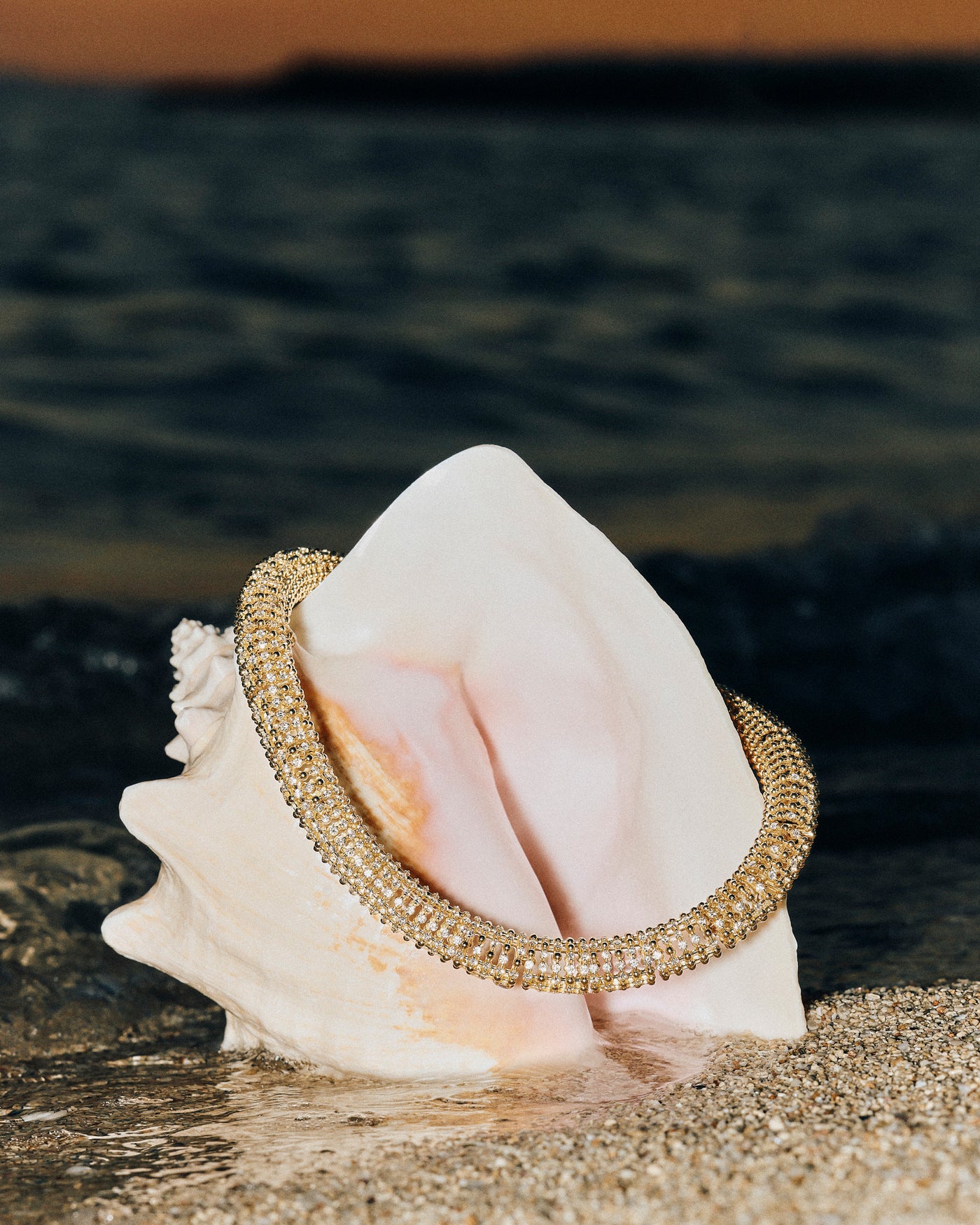 Full in shape yet glimmering with lightness, the Diamond Medusa Choker is formed by a framework of polished gold beads dotted with natural white diamonds. Designed in our Sydney studio from 18 karat solid gold, the voluminous silhouette mimics the allure of sea jellies rising from the depths of the ocean.