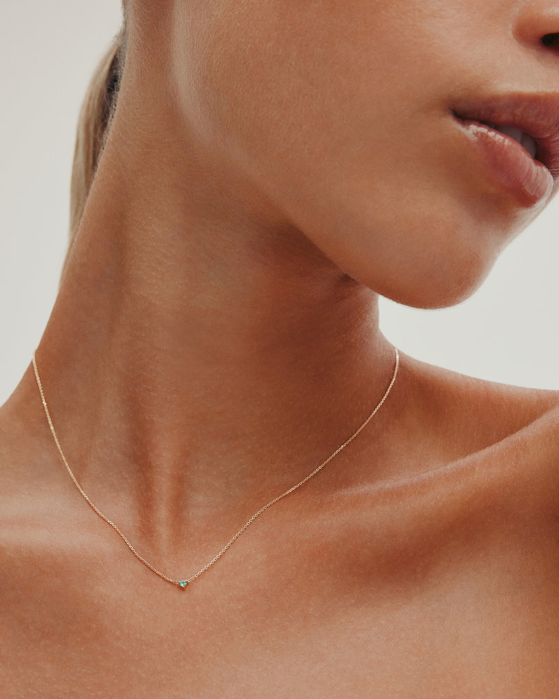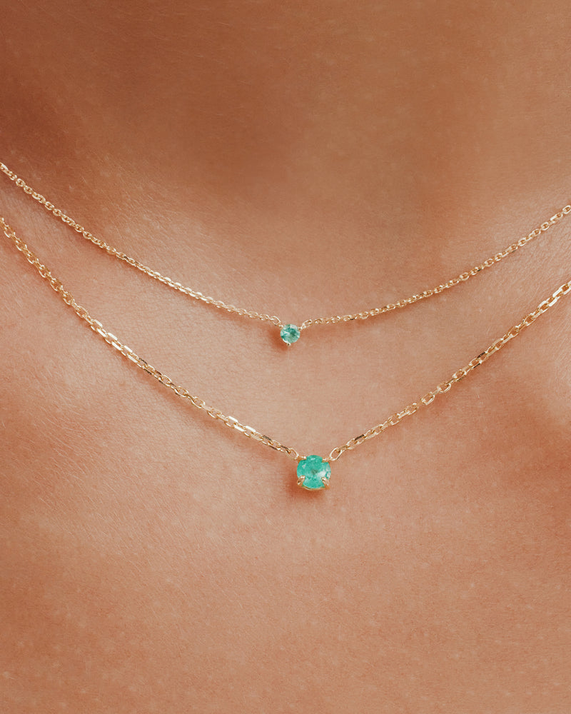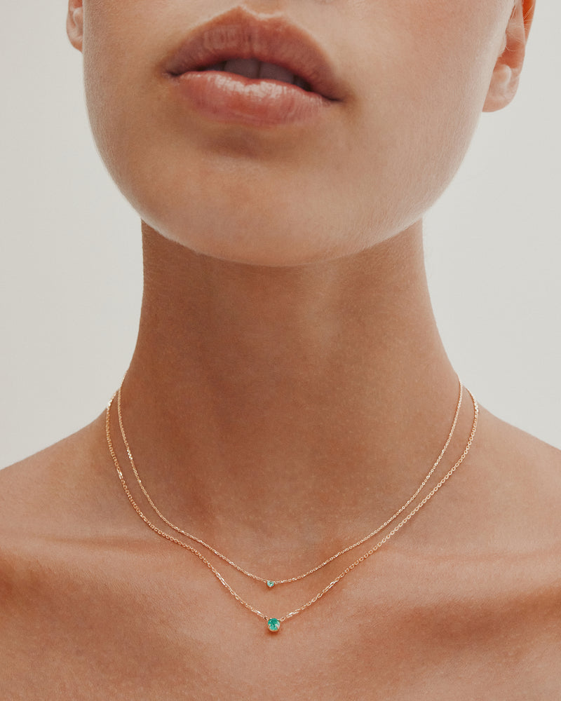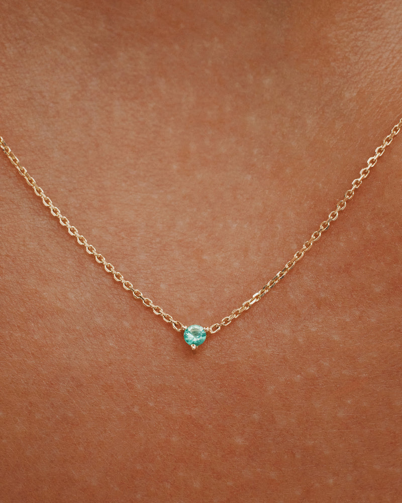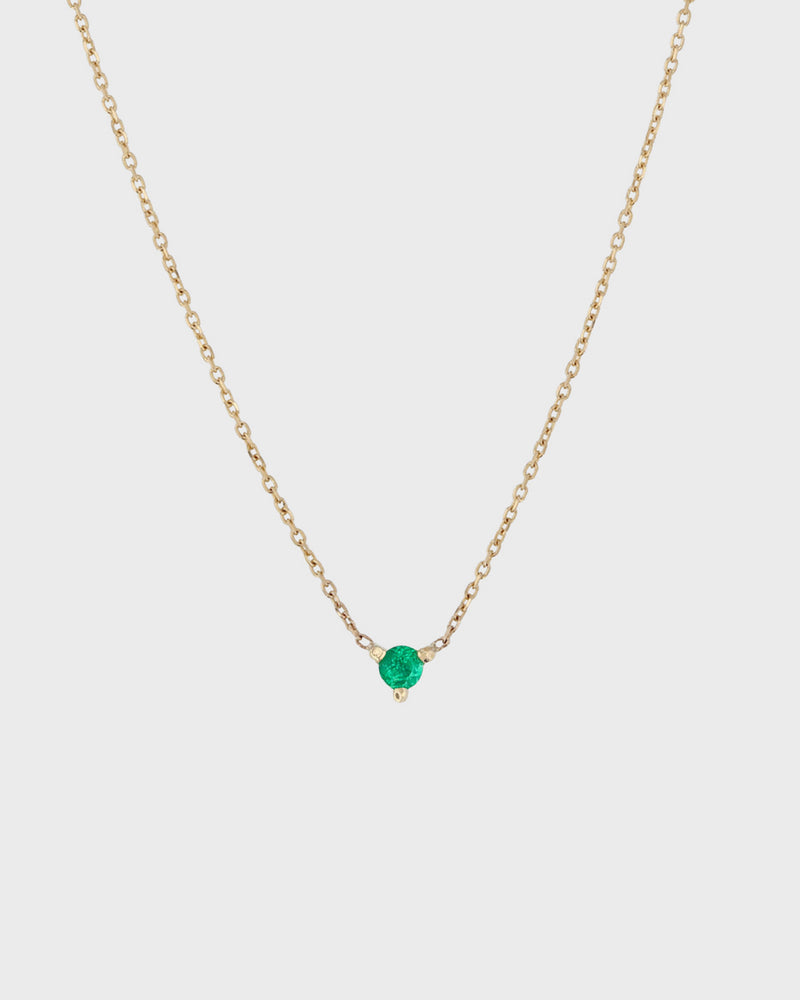 The Petite Emerald Birthstone Necklace is made in 14-karat gold and strung on our signature fine chain. Featuring precious gemstones corresponding to the month you were born. May's emerald has the symbolic meaning of fertility & wealth with magical qualities to prevent illness.