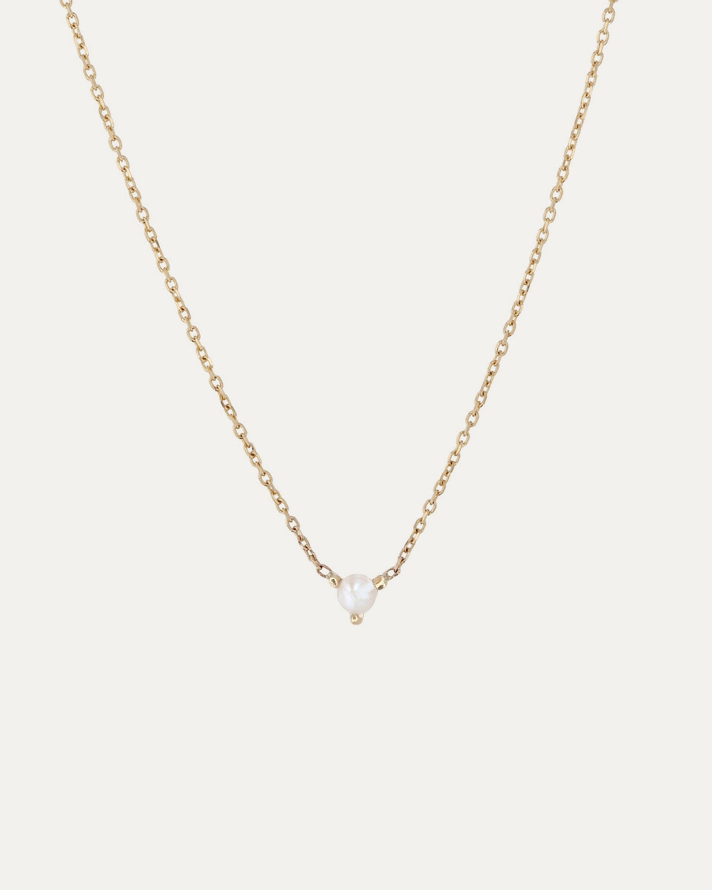 The Petite Pearl Birthstone Necklace is made in 14-karat gold and strung on our signature fine chain. Featuring precious gemstones corresponding to the month you were born. June's pearl has the symbolic meaning of purity & protection against nervous thoughts.