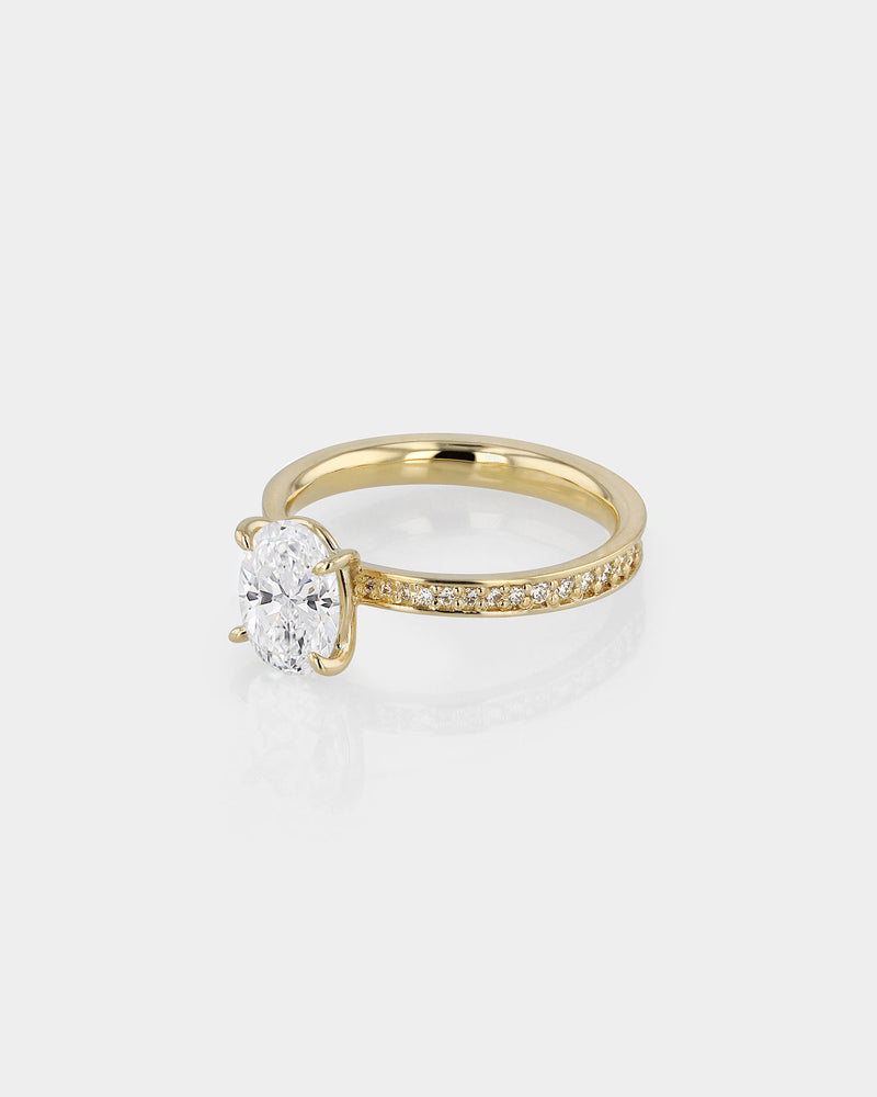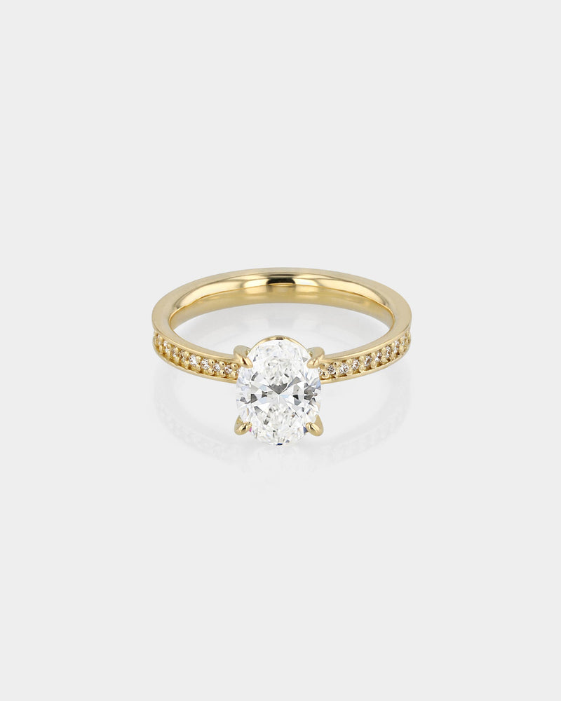 Experiment with design details that make up a SARAH & SEBASTIAN Engagement Ring. The Oval Channel Eternity Ring features an oval cut diamond on a claw set diamond band. All elements of this ring including band style, metal, carat and colour can be made bespoke as per your budget and request.